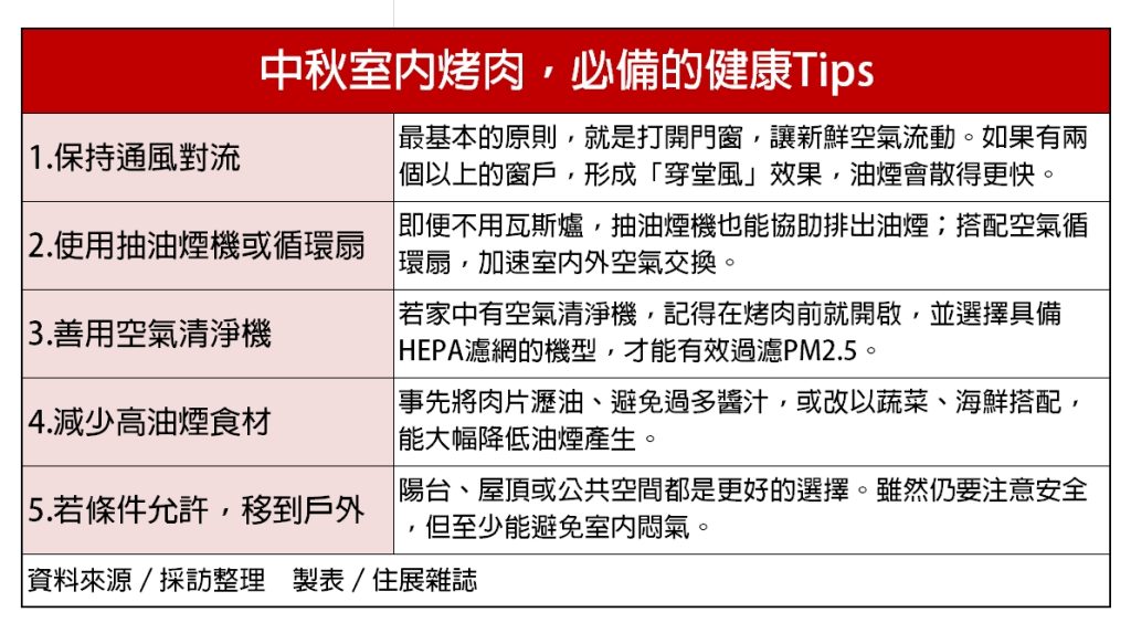 「其實,改善的方法並不複雜。無論是適度開啟窗戶、製造對流風,或是在餐桌旁加上一台空氣循環扇,都能在一定程度上稀釋油煙。」高愉勛補充,若家裡有空氣清淨機,提早啟動並保持運轉,也能讓室內空氣品質維持在相對安全的水準。