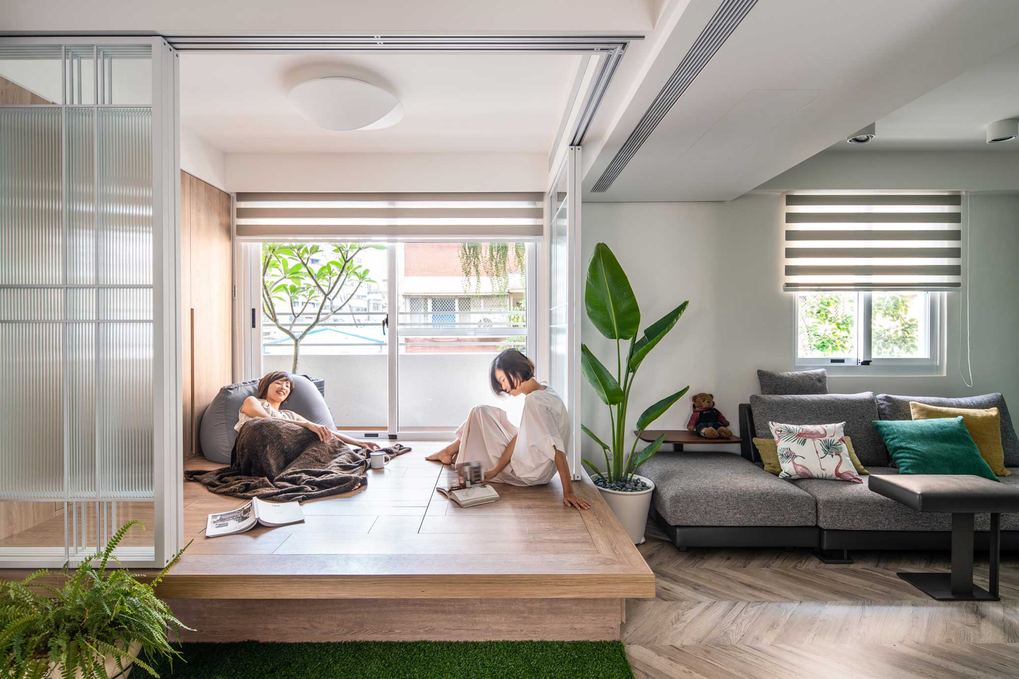 這次的空間格局希望跳脫以往家庭一進門是以客廳為主軸的概念,把房間位移調動並把分間牆打掉,客廳往內移,房間往外移,兩個空間對調做成一個開放式多功能的使用空間,房間改成開放式可以當臥室、和室、聊天室、麻將室等等⋯⋯