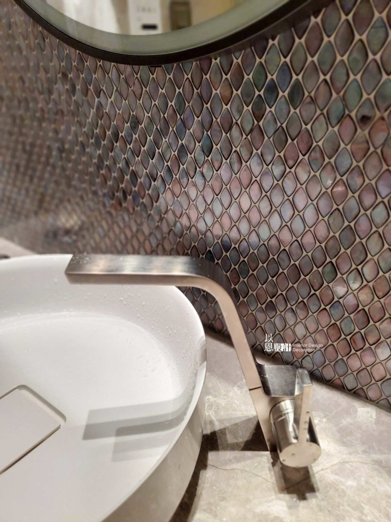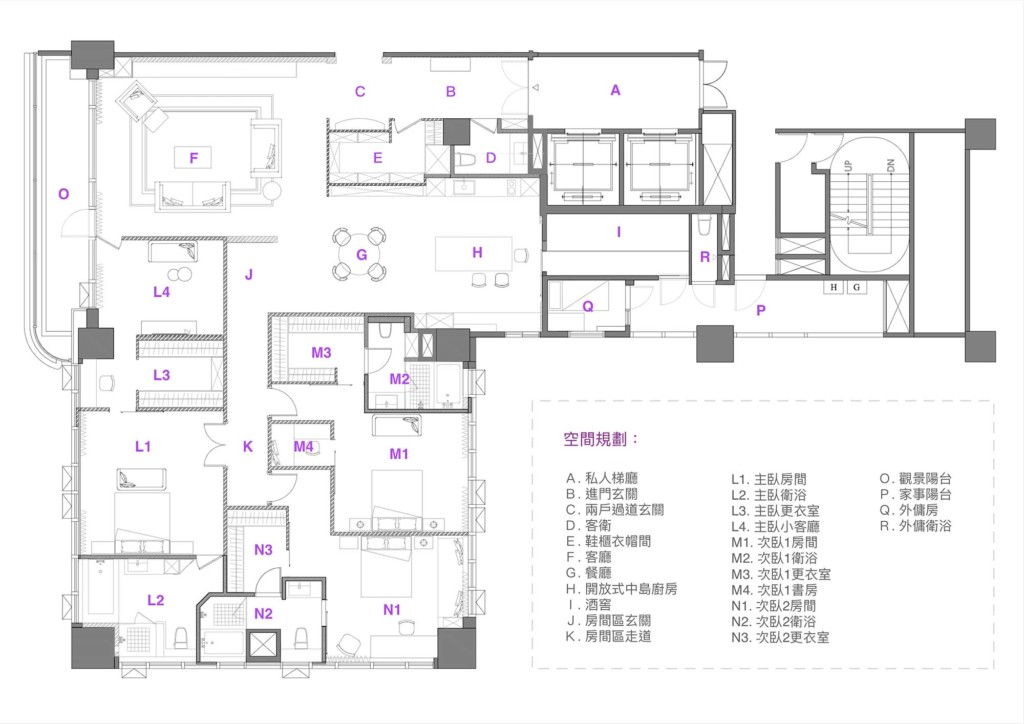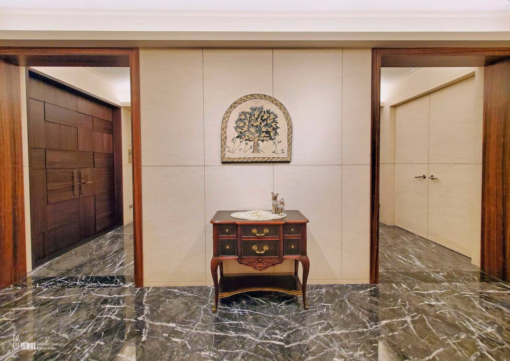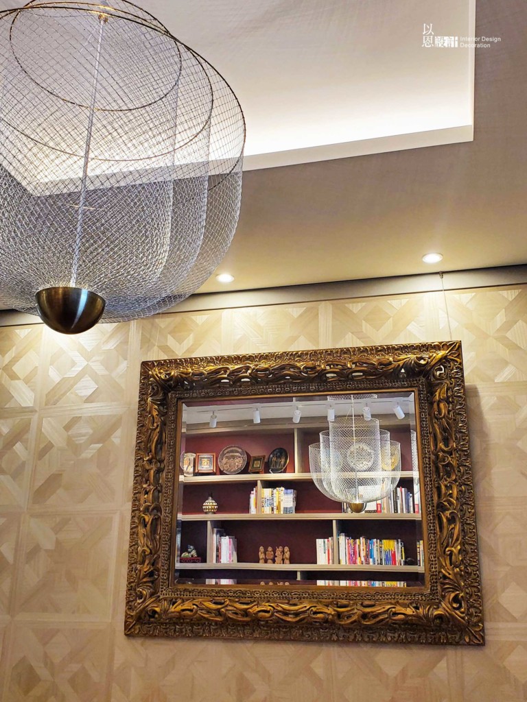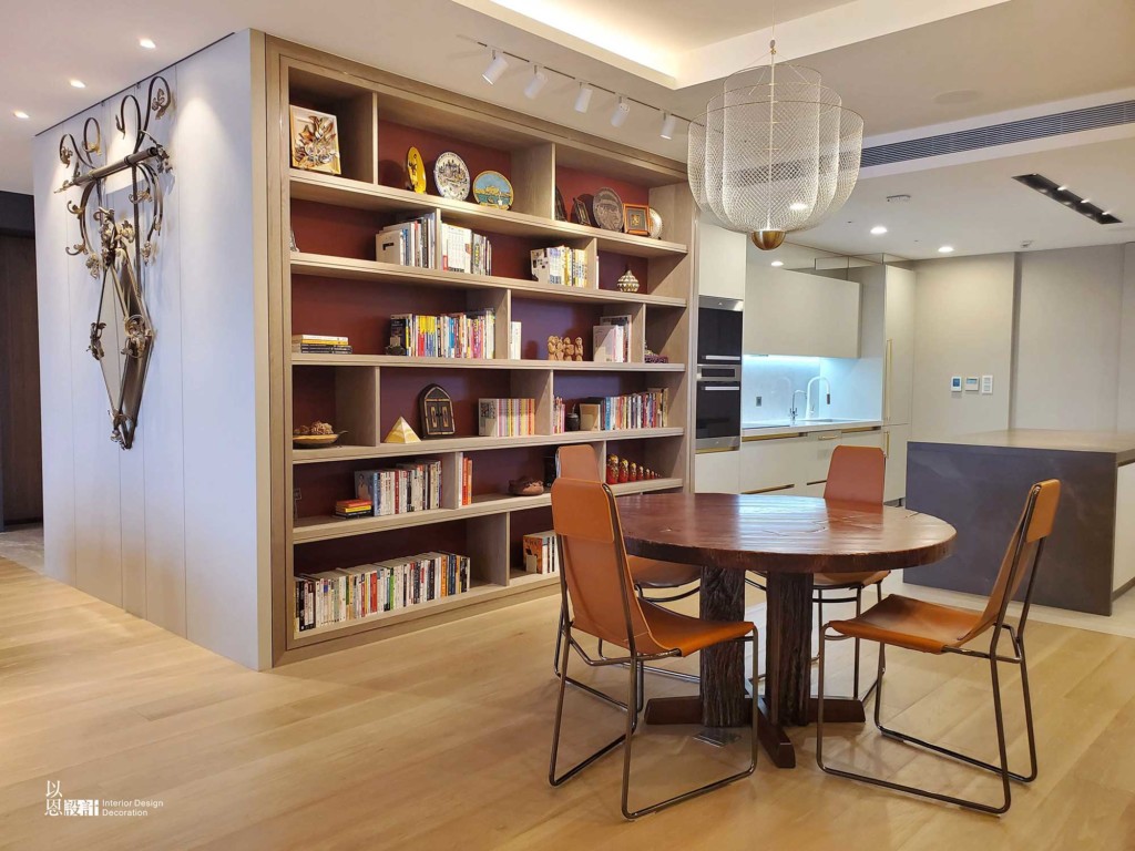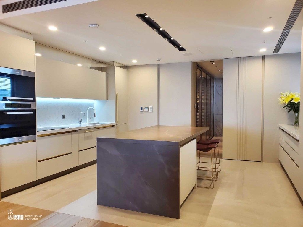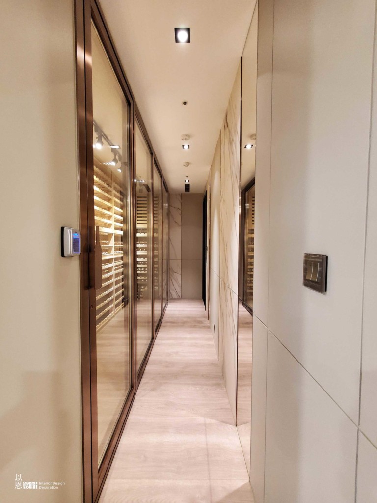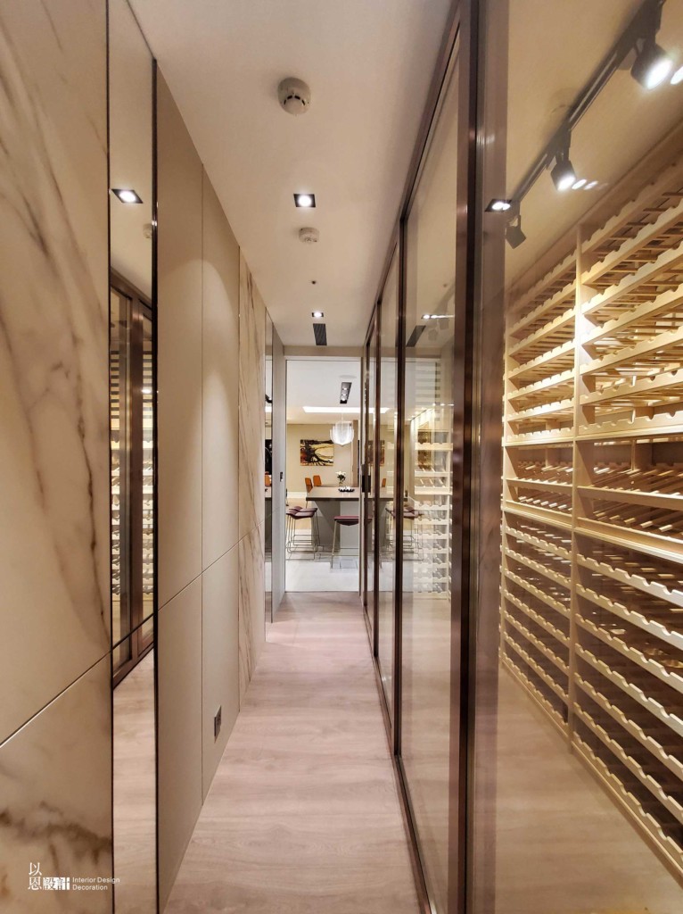 本案為兩戶打通的其中一戶,且為另一戶完工後才開始設計施工,因此空間規劃與該戶設定走向完全不同,較為輕鬆休閒,也在某些空間上補該戶的不足。例如:客廳不放電視改作家庭電影院、將內廚空間改為私人酒窖、餐廳為休閒使用只需4張餐椅,有些家具是沿用原有的。