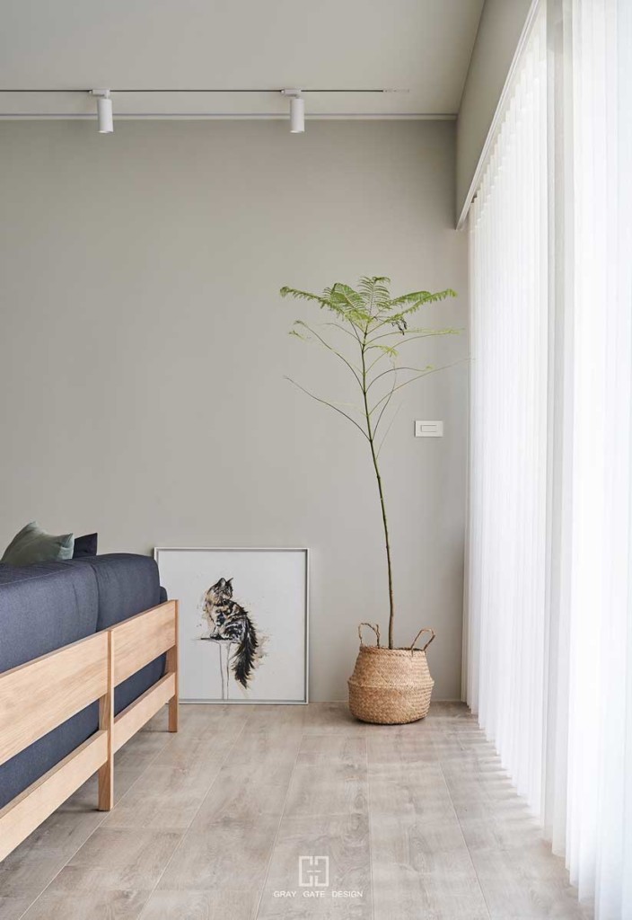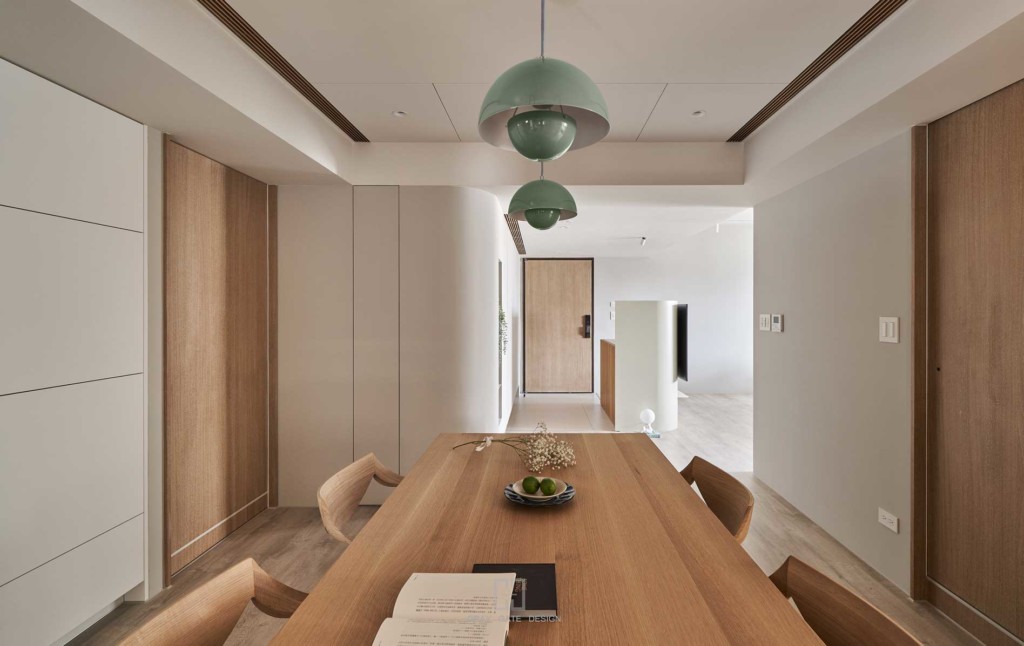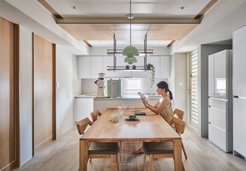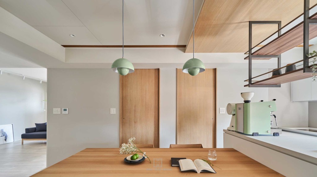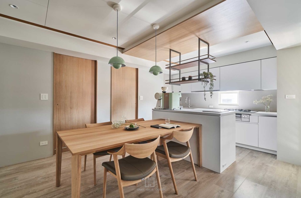 陽光普照,白透之間,木質暖色配襯,綠色點綴。客廳小空間,放置木質小桌與懶骨頭,搭配窗外的藍天與陽台植物創造出一幅變動的畫作。 餐廳處的異材質天花,修飾大樑外,並與中島方向呼應。保留廚房小窗,讓光線透進廚房內,在木質與白色之間變動,體驗悠悠的愜意。