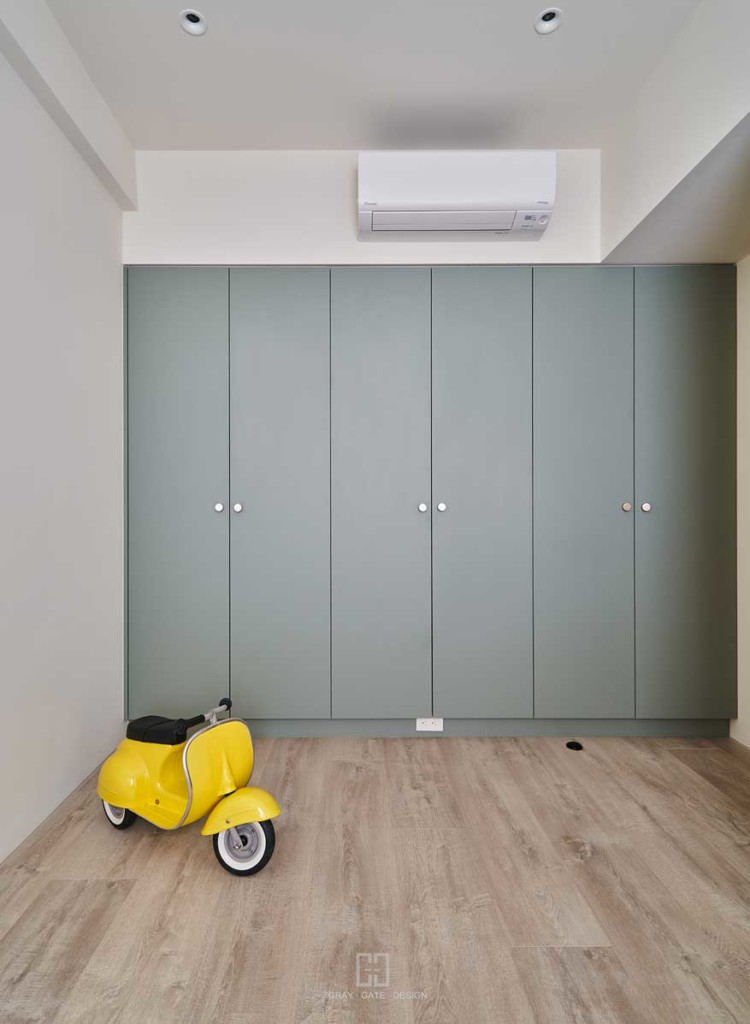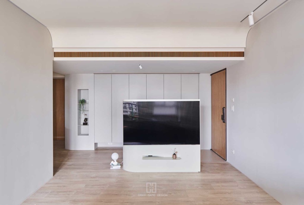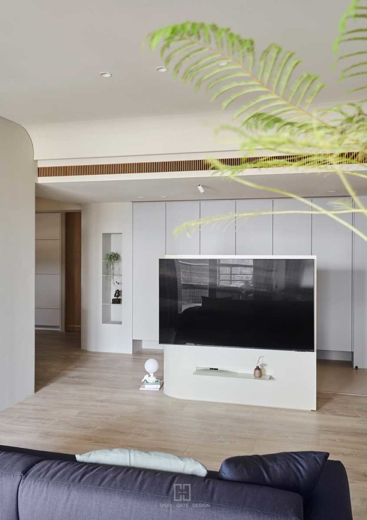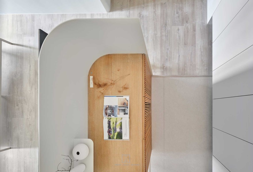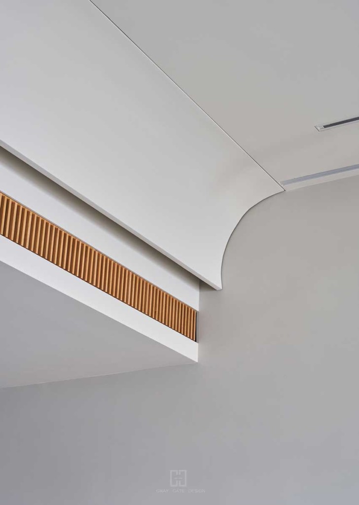 陽光普照,白透之間,木質暖色配襯,綠色點綴。客廳小空間,放置木質小桌與懶骨頭,搭配窗外的藍天與陽台植物創造出一幅變動的畫作。 餐廳處的異材質天花,修飾大樑外,並與中島方向呼應。保留廚房小窗,讓光線透進廚房內,在木質與白色之間變動,體驗悠悠的愜意。
