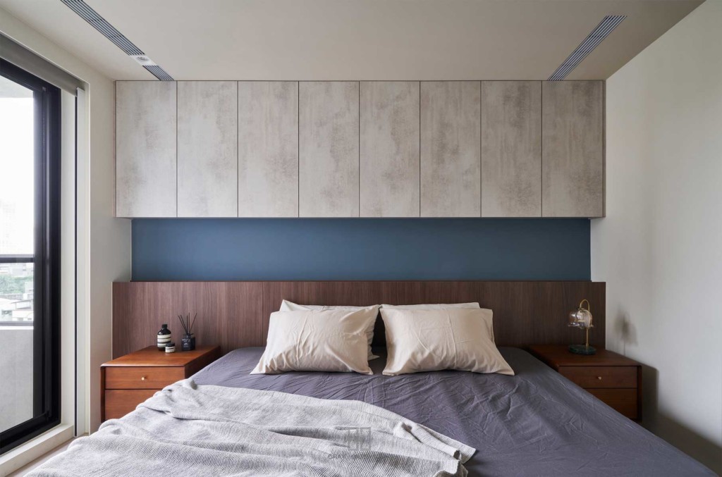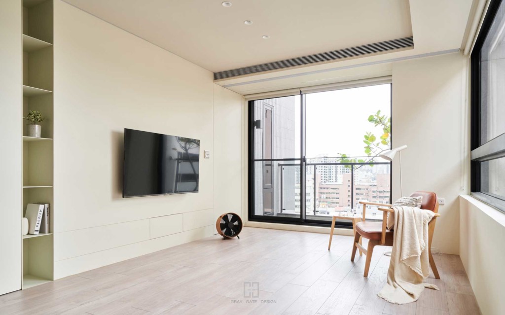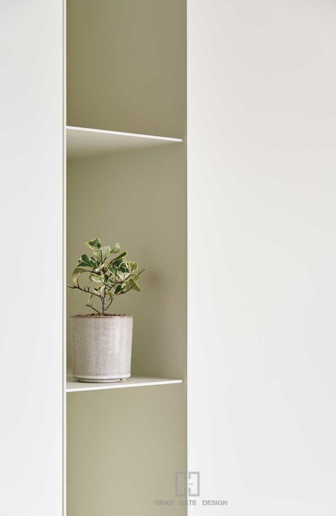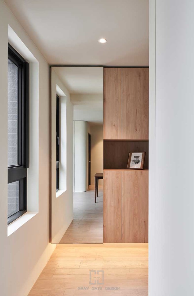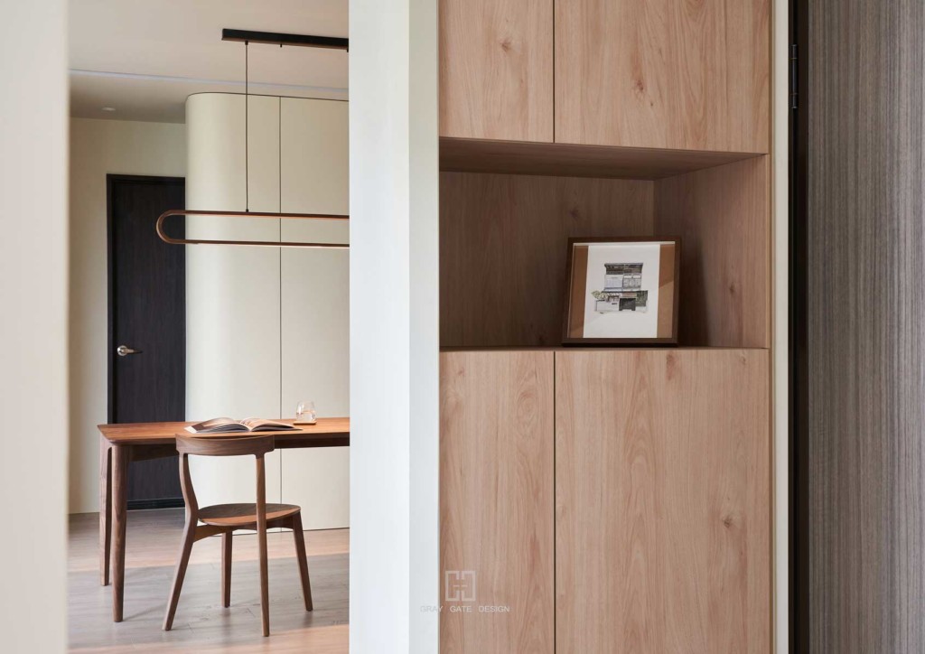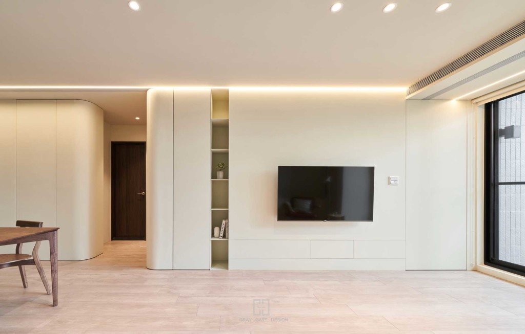 暖色調油漆,木紋櫃體,如陽光室般溫暖,弧形櫃體門片,柔化轉折處的銳利感。