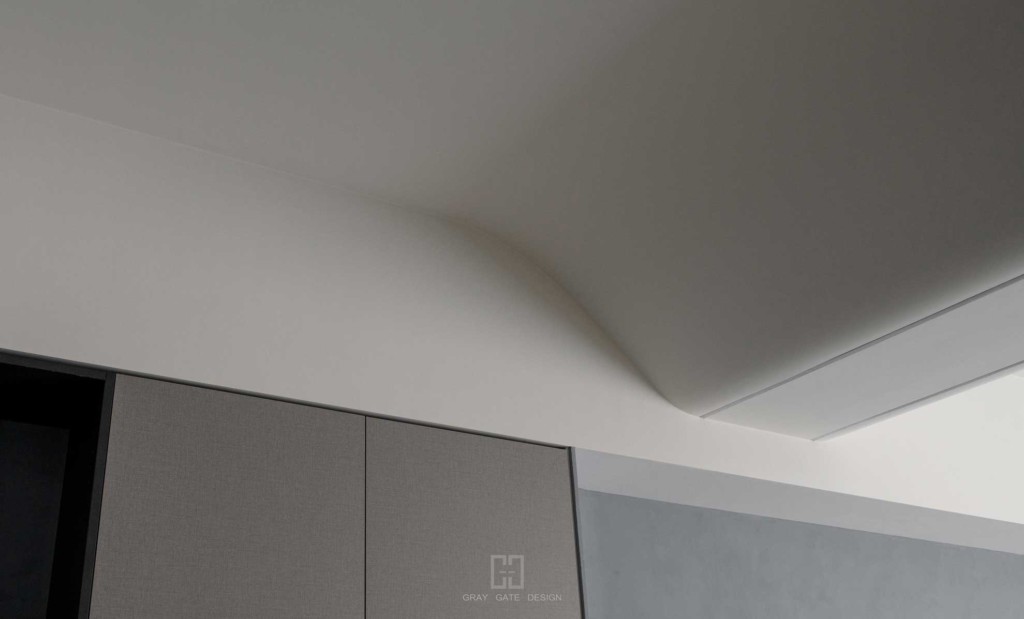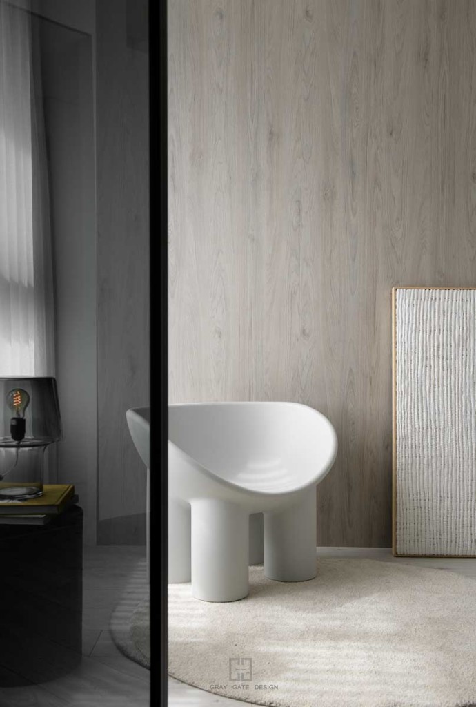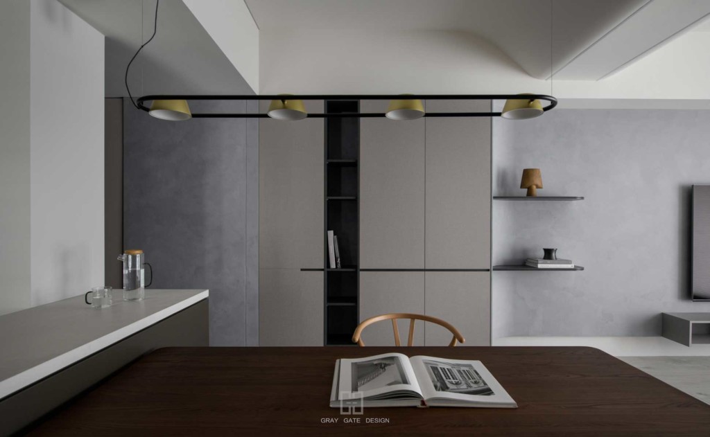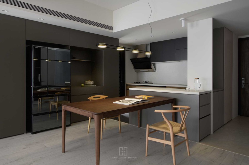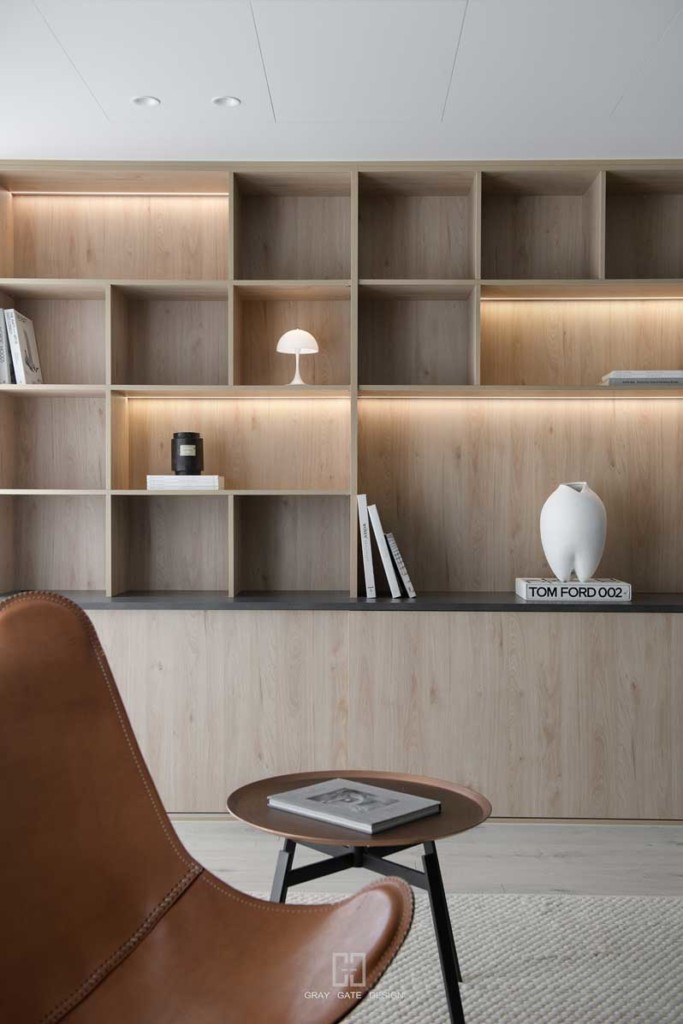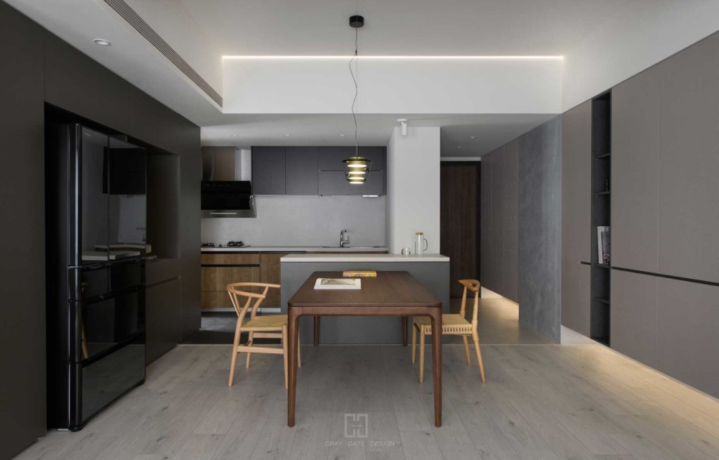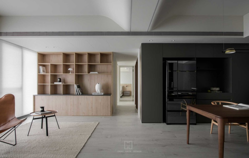 顏色與風格是現代風的冷色調當中,透著溫潤的木頭與金屬作為點綴,讓整體有著神祕中又帶著溫暖的感受,乾淨的線條搭配弧形,有著俐落中的小趣味。