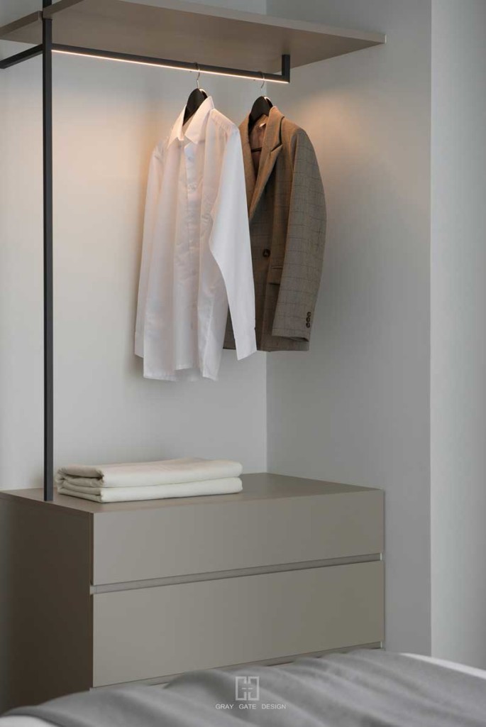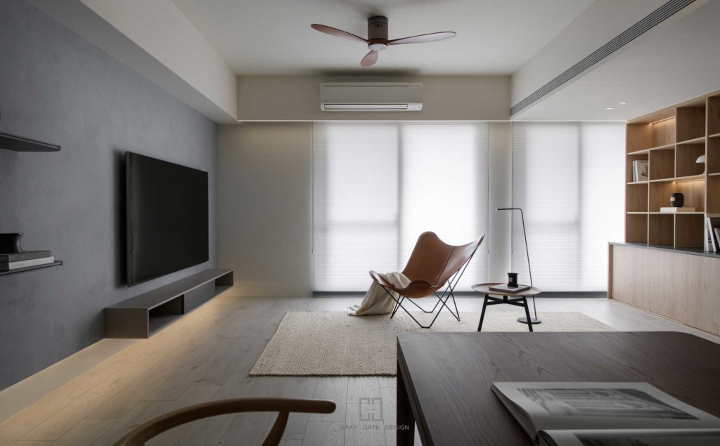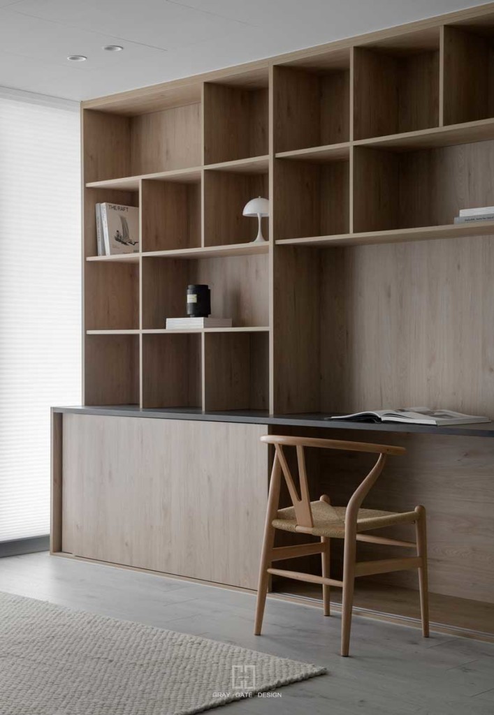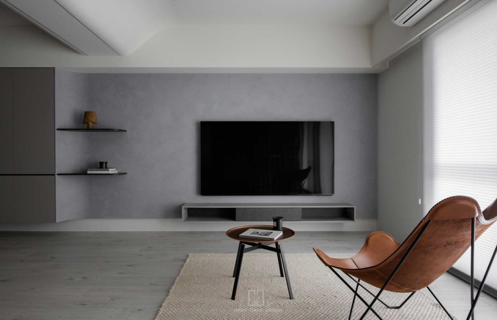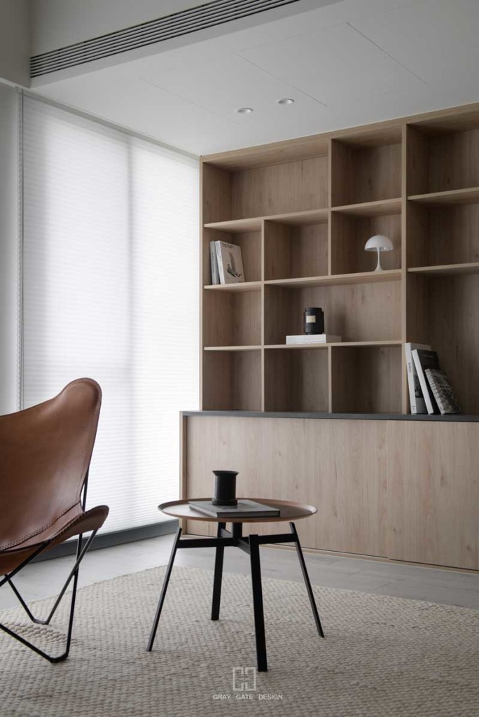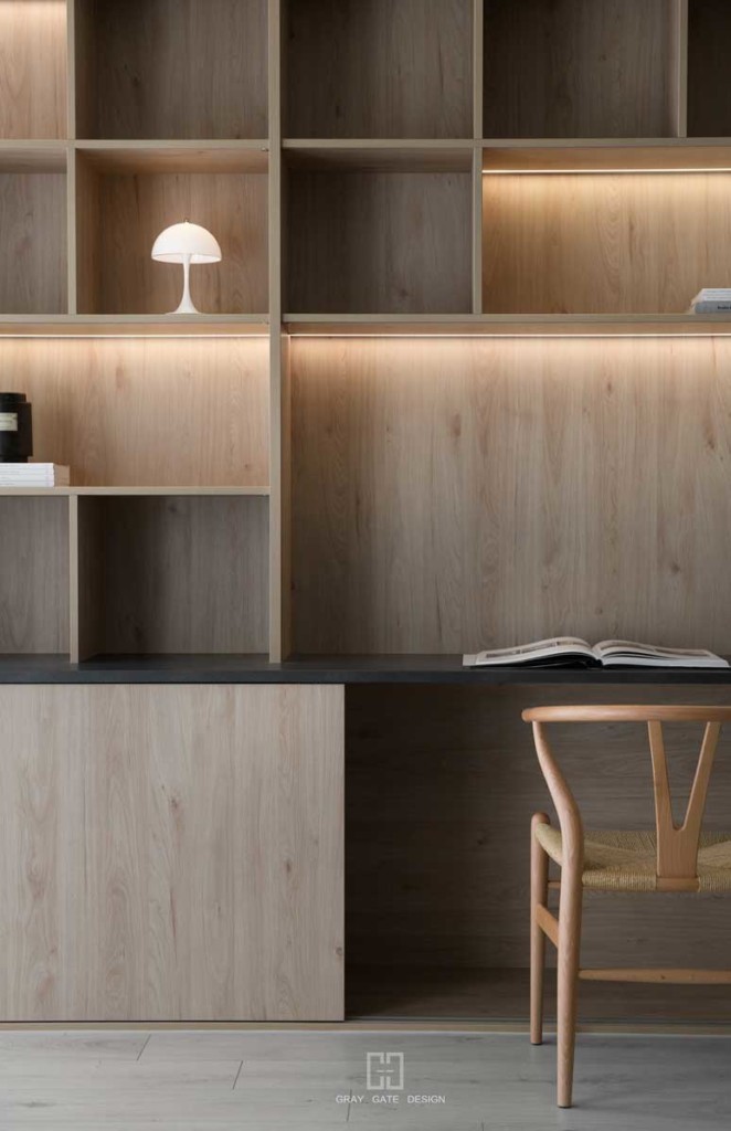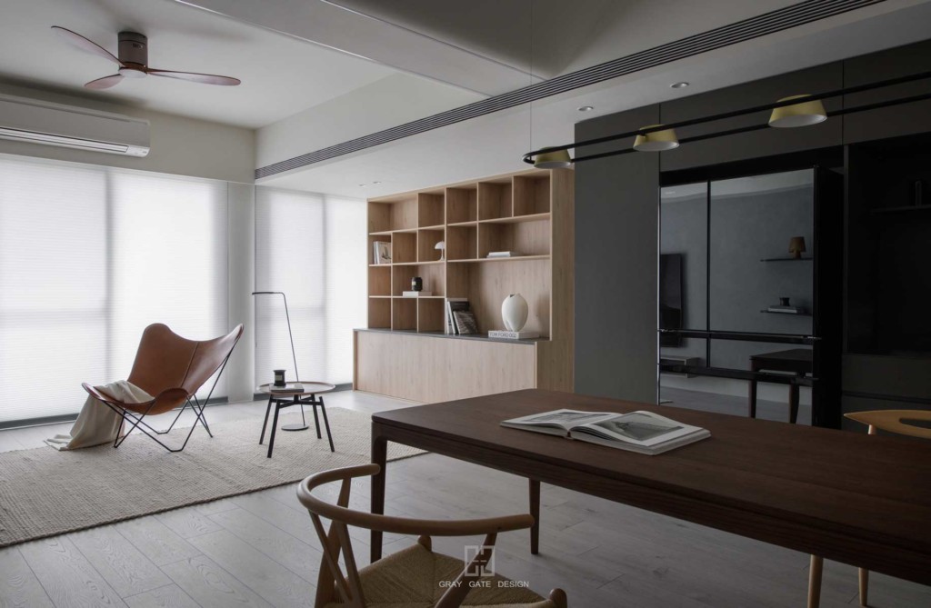 顏色與風格是現代風的冷色調當中,透著溫潤的木頭與金屬作為點綴,讓整體有著神祕中又帶著溫暖的感受,乾淨的線條搭配弧形,有著俐落中的小趣味。