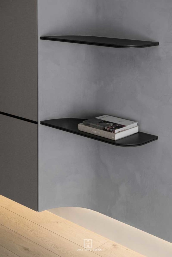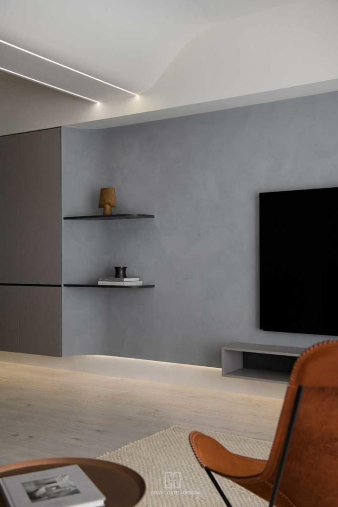 一進門,玄關與電視牆的顏色延伸,深色畫布中展現線條的變化與層次,弧形的過度連接電視牆,書櫃檯面黑色線條與電視牆層板延伸旁邊櫃體把手呼應,將細節悄悄放置其中。
