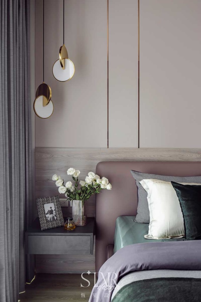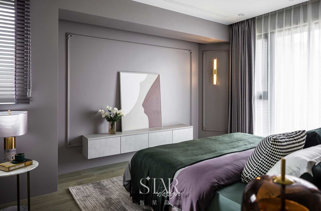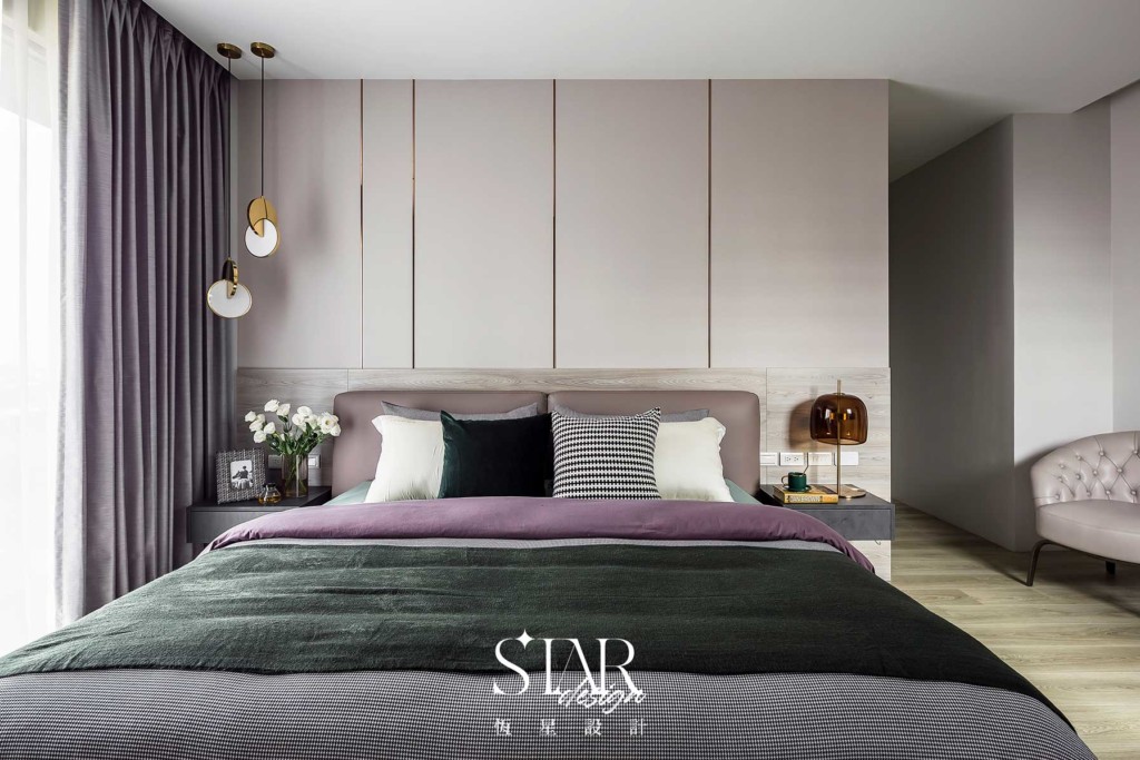 主臥室延續客餐廳的風格,以夢幻的藕紫色呈現柔和氛圍,有如在法國普羅旺斯薰衣草園悠遊,是夫妻倆人嚮往的愜意生活。低彩度的主色調圍塑出安穩的臥眠空間,與木質地板巧妙融合,溫馨、 粉嫩的質感脫穎而出,優雅的法式線板搭配精緻的燈飾點綴,有如飯店質感的套房設計。