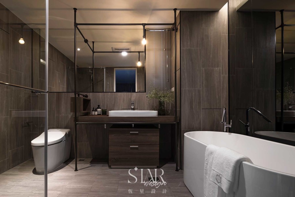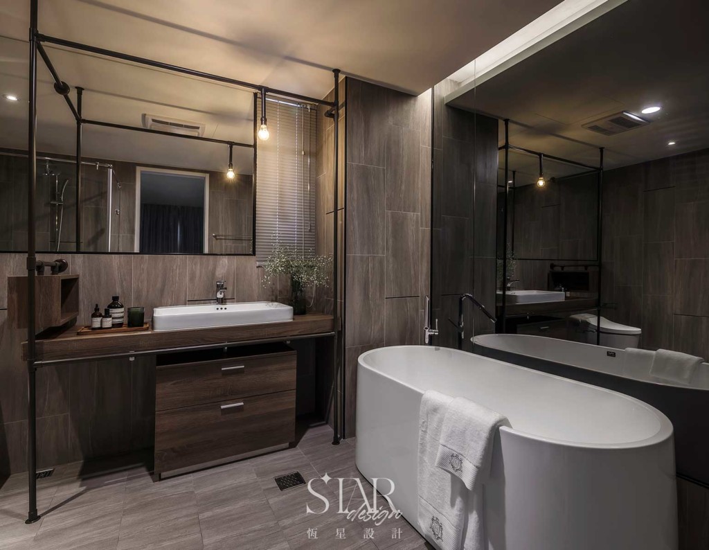 主衛浴的牆面及地板重新規劃,使用木紋磁磚結合深色木紋櫃體,增添衛浴空間的高雅感,深色的金屬鐵件及小巧燈泡,營造法式飯店的視覺感及身心靈的享受。