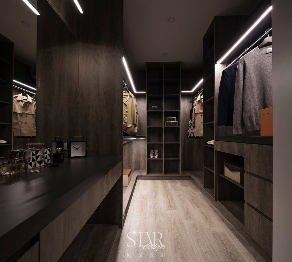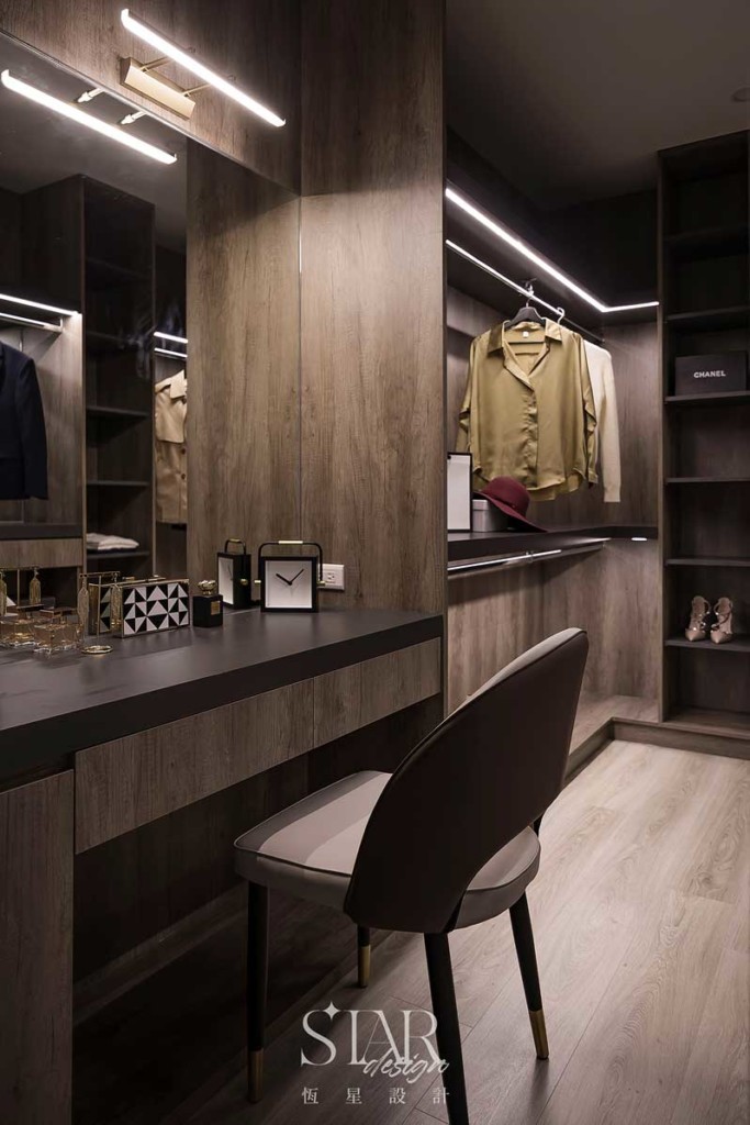相較於客餐廳的明亮通透,女屋主希望更衣室能夠有個人天地的私密感,可以穿梭在衣物之間思考穿搭、從容地完成妝容,低調奢華的深色木紋在精緻燈條的照射下,更凸顯其神秘、典雅的氛圍。