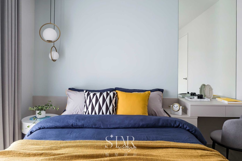 姊姊的個性較為沈穩,喜歡簡約中性的色調,天藍色就像晴空萬里時,洋溢活潑的藍天,曬著剛剛好的和煦陽光由淺藍色的主牆延伸,選用了海軍藍的寢具,跳芥末黃的床飾則襯托出沈穩中的活潑俏麗,精緻的圓形金色吊燈托著圓弧形的燈體,在夜晚點亮時如同月球般典雅溫馨。