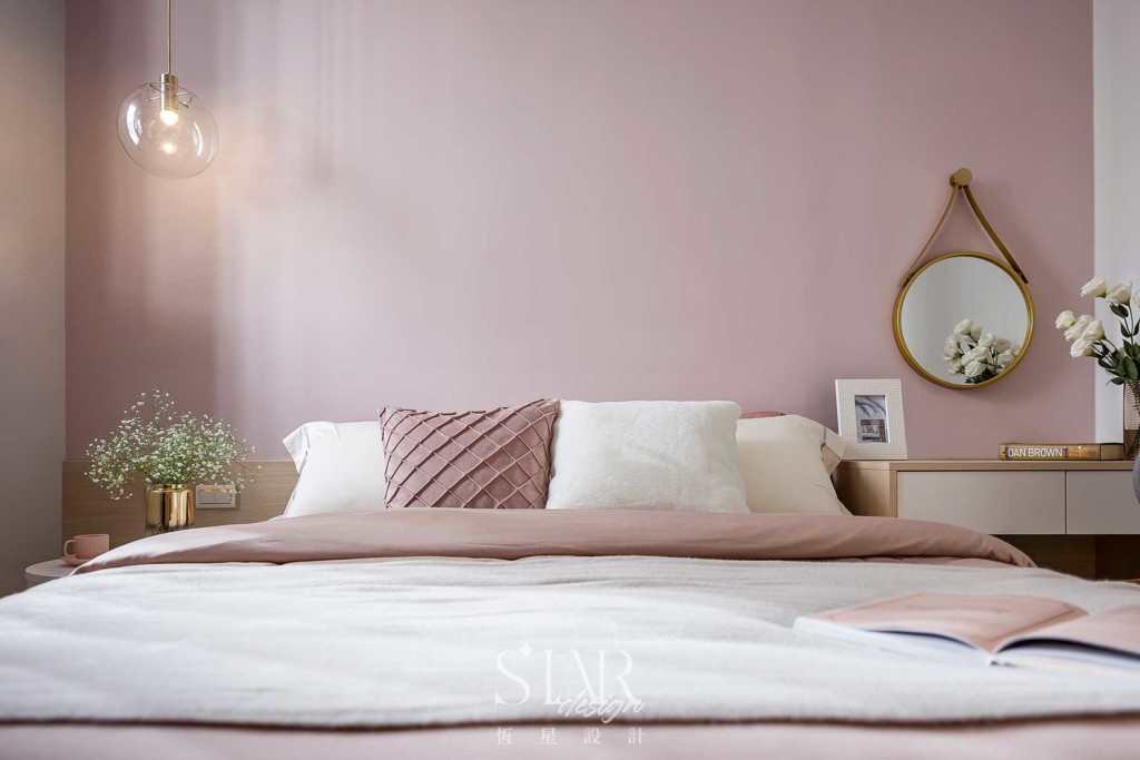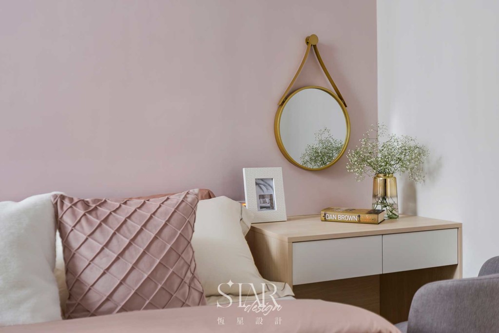 妹妹的臥室設計則以少女風格為主,夢幻的莫蘭迪粉色牆面,搭配透明設計的吊燈與床邊小飾品,營造少女般的甜美細膩,粉色格紋抱枕及白色絨毛抱枕則為溫婉的空間帶出一點個性設計。