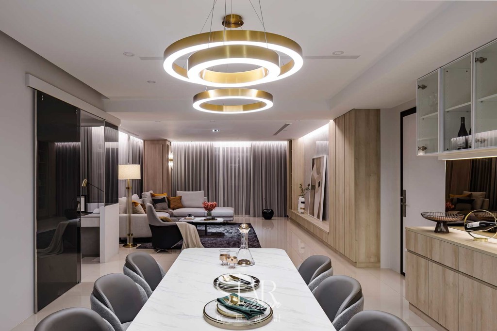客餐廳採開放式格局規劃,並將屋主最在意的屋內大樑以木作設計及金屬壁燈巧妙修飾成具有法式感的精緻壁面。選用法式柔和的灰白色系為基底,利用傢俱軟件塑造柔雅氛圍,挑選帶有高級感的灰色L型沙發於窗邊,鐵灰色柔軟地毯將空間自然區隔,大面的落地窗讓千絲萬縷的暖陽自然揮灑於客廳。另一頭的餐廳區則選用金色圓環吊燈注入精緻質感,成為空間吸睛亮點。