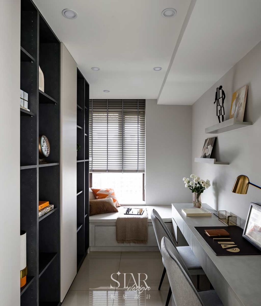 書房空間採用百葉窗讓陽光自然宣洩,窗邊的臥榻設計作為放鬆的空間並增加了收納量,兼具休憩及女兒們讀書自習的多功能空間。