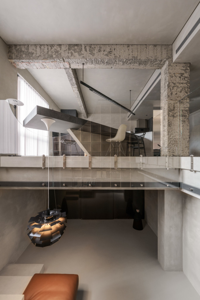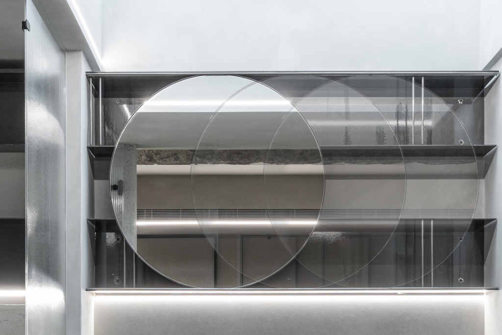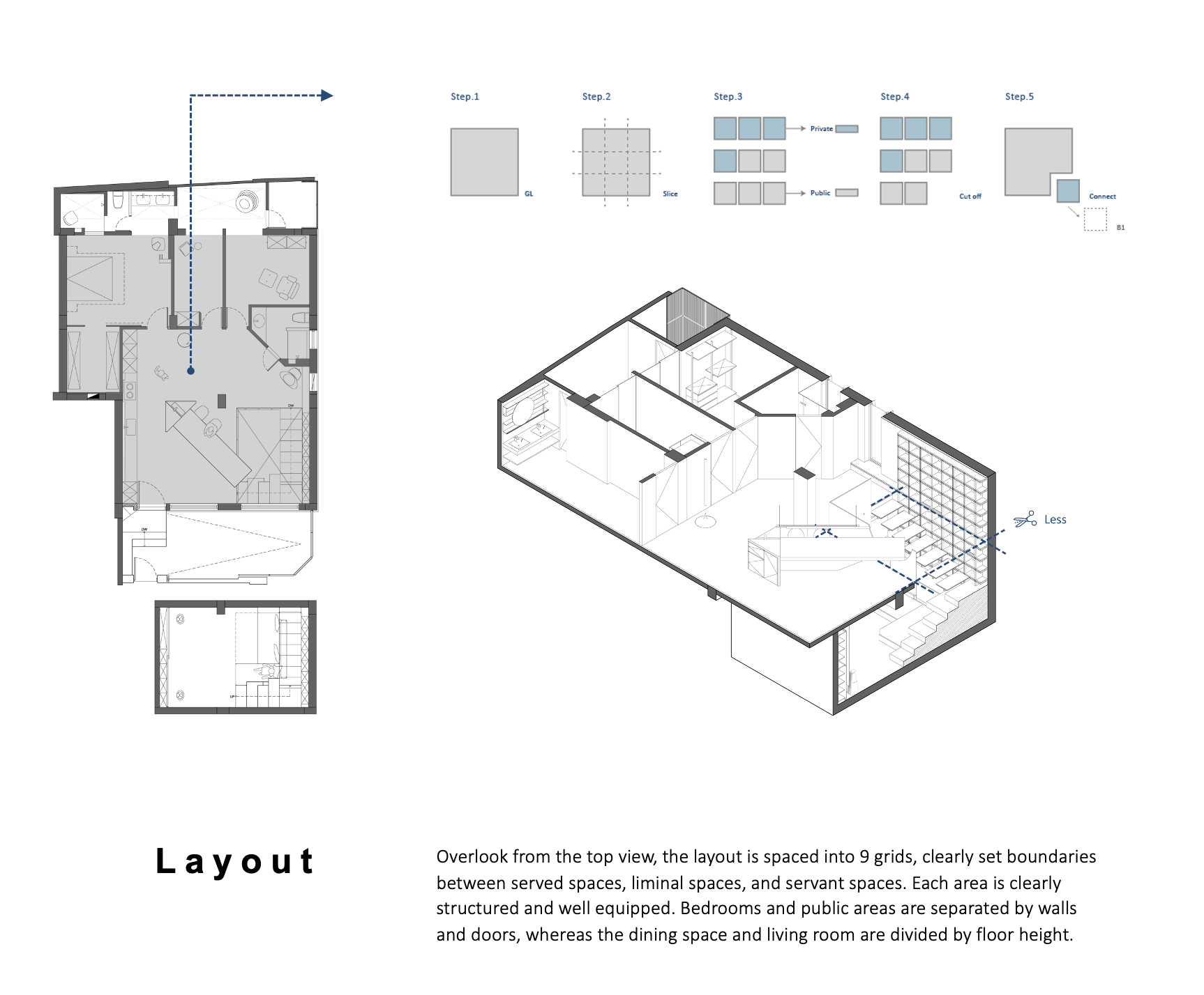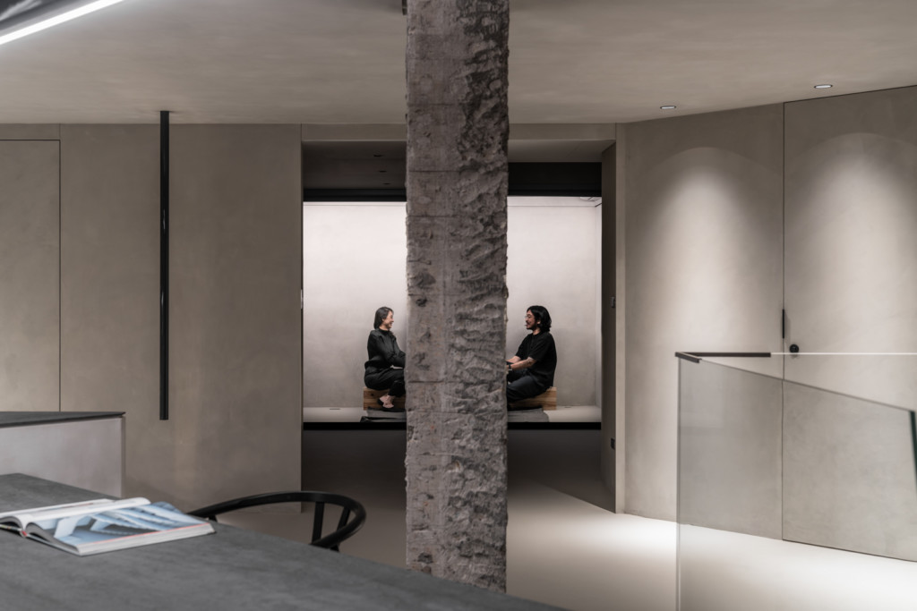 The site property was built 30 years ago, and its original plan includes a ground floor and a cramped basement. As remembrances of the building itself, exposing existent structures as minimalist decorations. For example, intentionally keep partial beams and columns in austere surfaces, and preserve a circle of rough cement on the ground floor as a unique inlay. Besides, oxide iron on pendant lights reflect a unique timeworn touch, cohere to the building agedness.