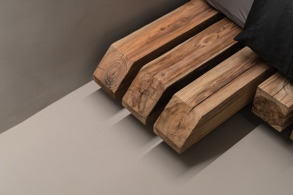 床架採用了台灣原生種柳杉,取材自新竹山區,歷經靜置、乾燥,保留了原始樹木的年輪及裂痕。
