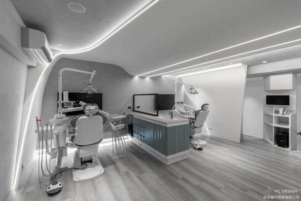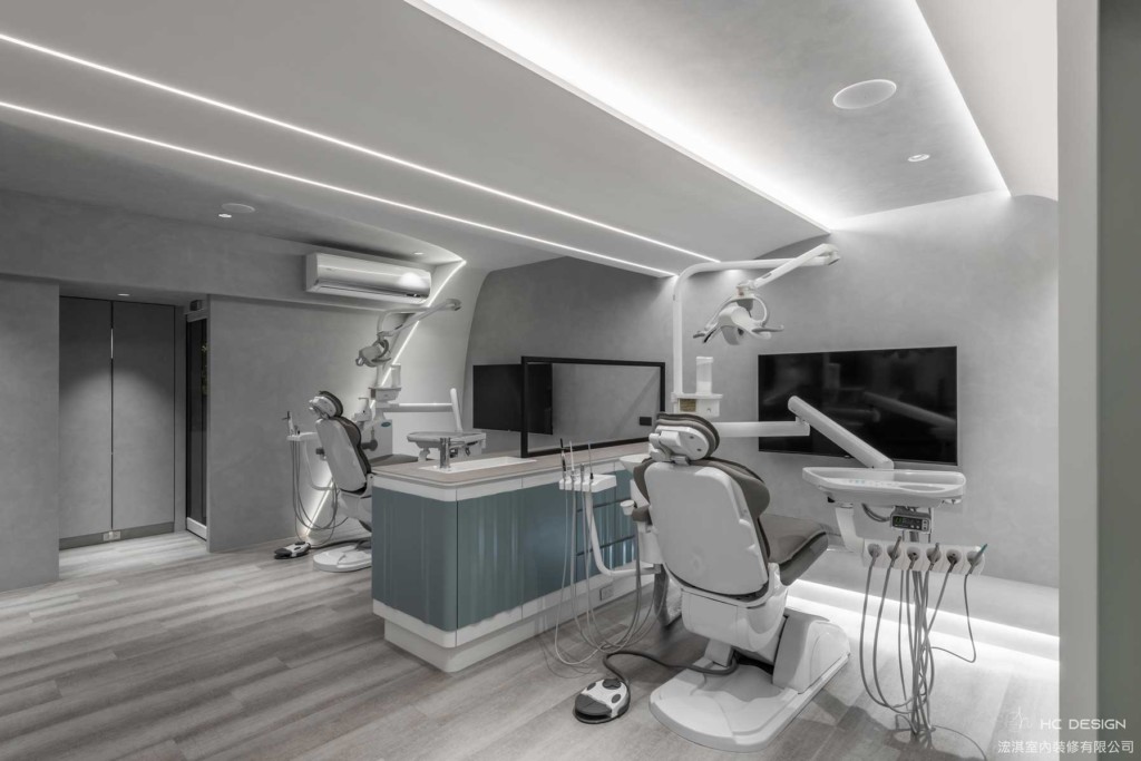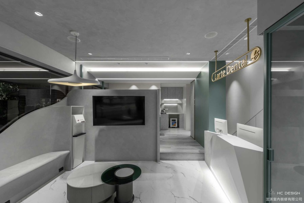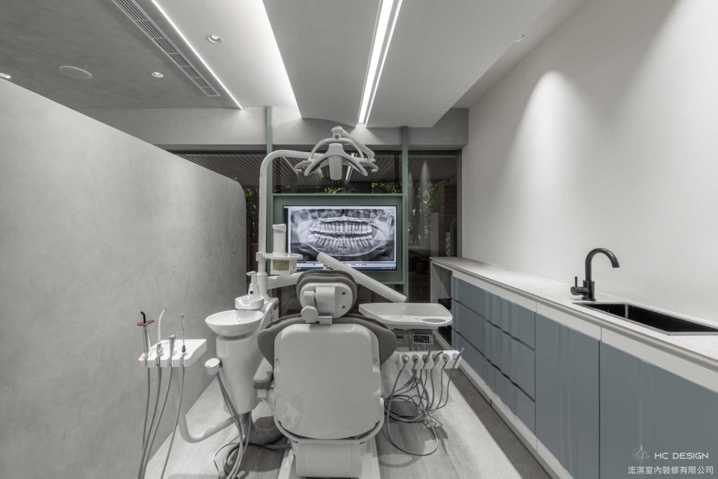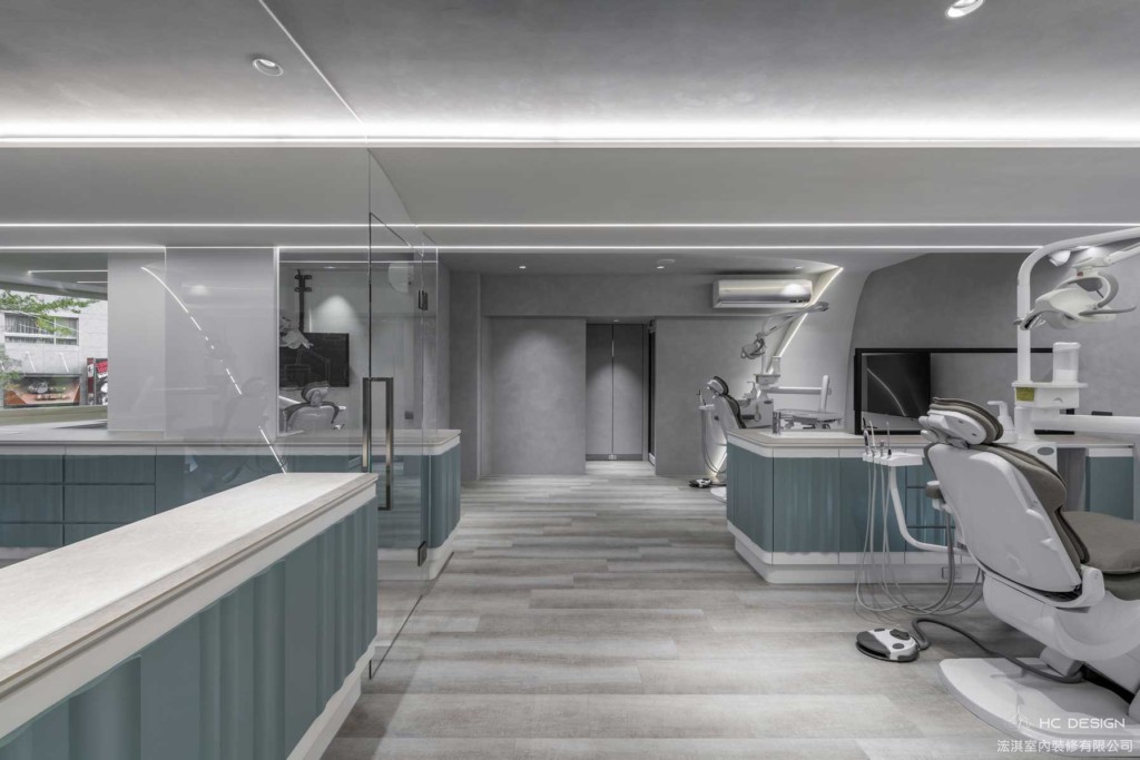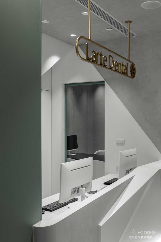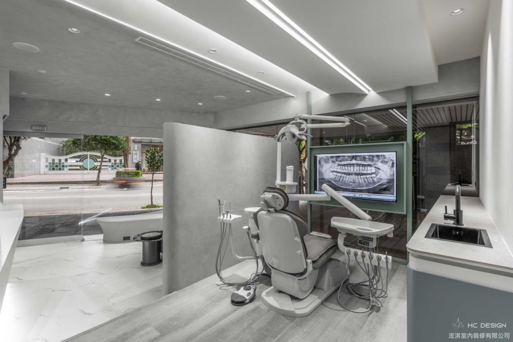 強調空間的起伏與流動讓空間更有層次,灰色是空間的基底,襯托性最高、包容性最強,搭配潔淨的白與清新的綠讓空間沉穩也不單調,肆意在簡單的色彩裡面流淌,俐落的切線與柔和的弧線做空間搭配,理性與感性之間有很好的轉換,讓牙醫保留專業感也存留不少溫度在其中。