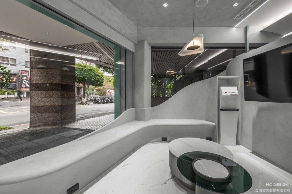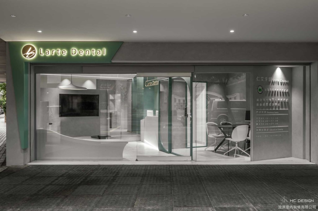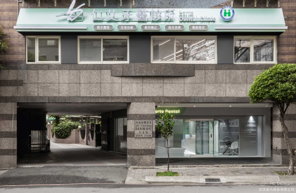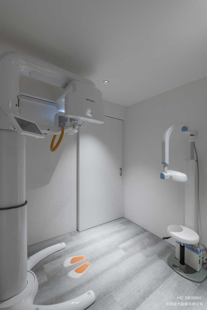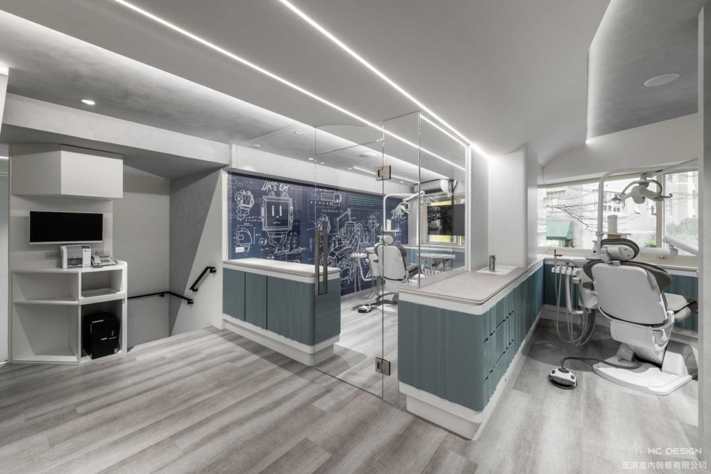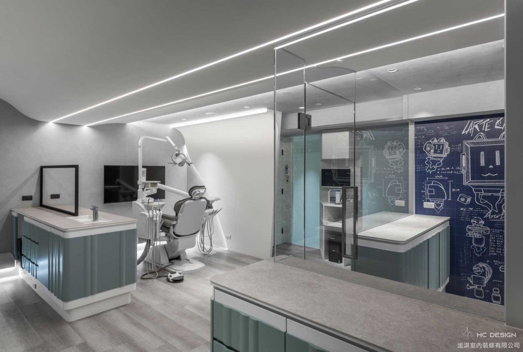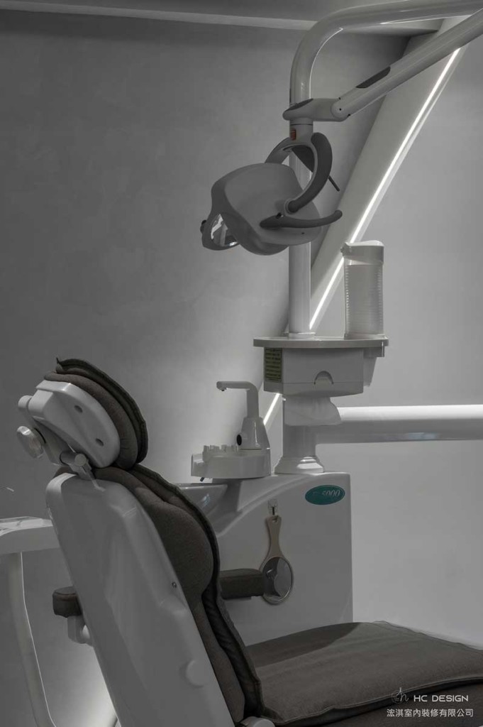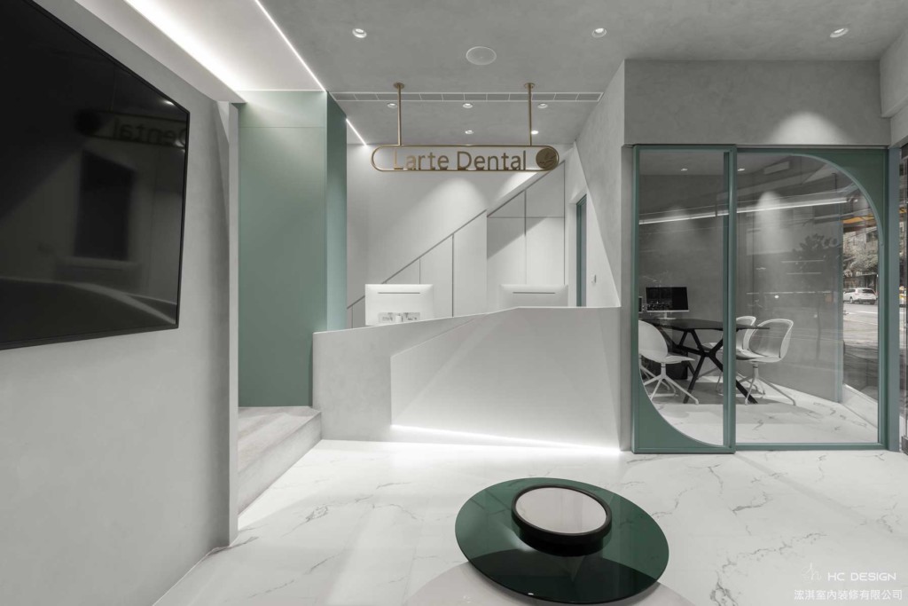 強調空間的起伏與流動讓空間更有層次,灰色是空間的基底,襯托性最高、包容性最強,搭配潔淨的白與清新的綠讓空間沉穩也不單調,肆意在簡單的色彩裡面流淌,俐落的切線與柔和的弧線做空間搭配,理性與感性之間有很好的轉換,讓牙醫保留專業感也存留不少溫度在其中。