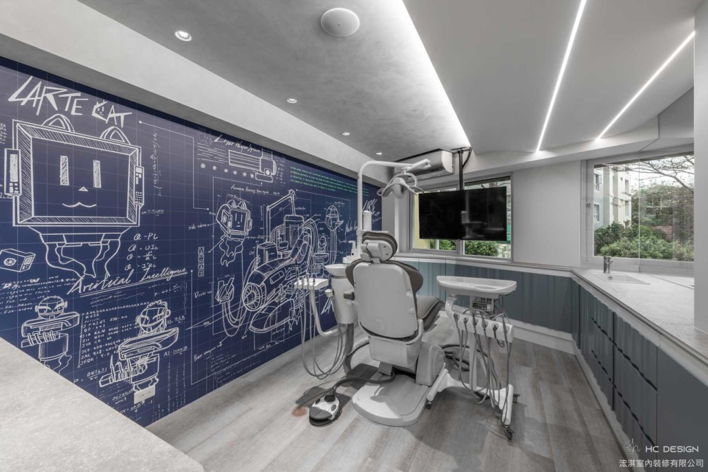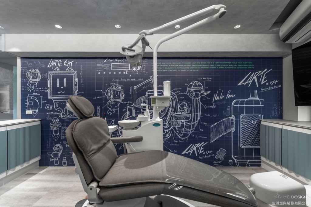 二樓則是跳脫普通的架構,做出更接近科幻的風格,並且帶入太空艙的弧線設計,讓患者有不同感官的體驗,在手術室牆面特別繪製出屬於仁艾牙醫的科幻藍圖,一種對於未來的幻想,憧憬的時代。
