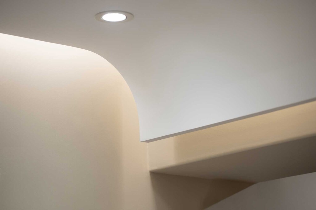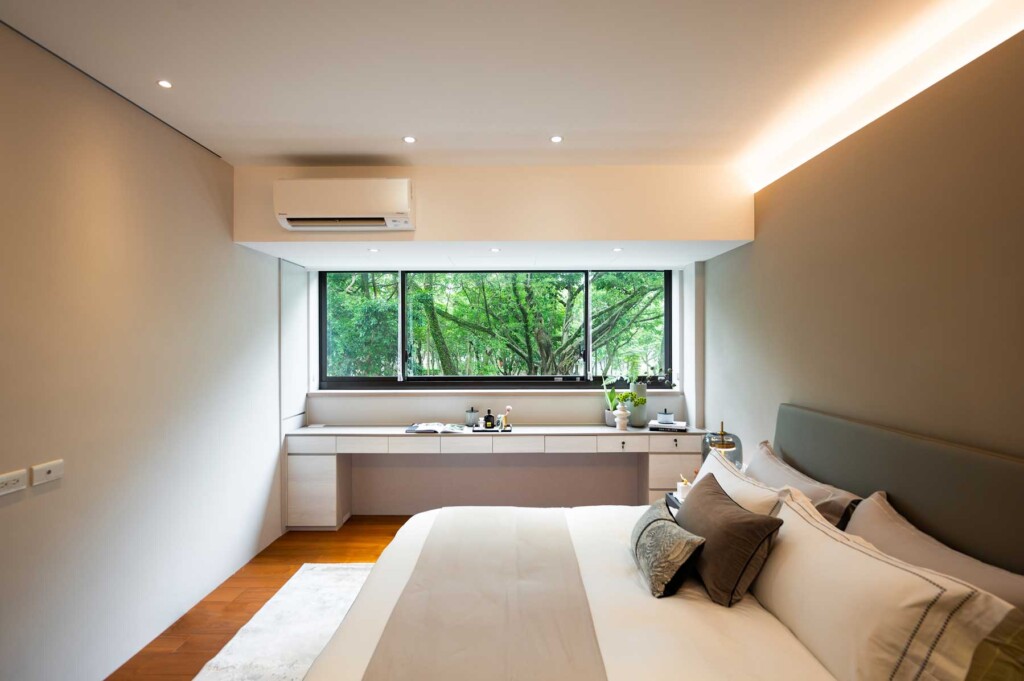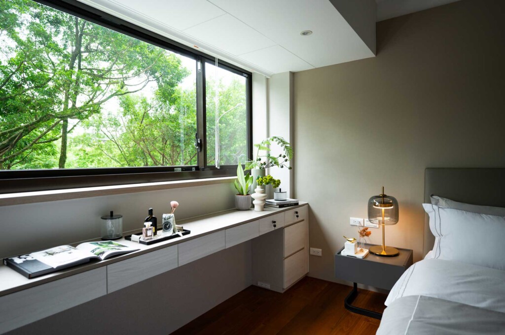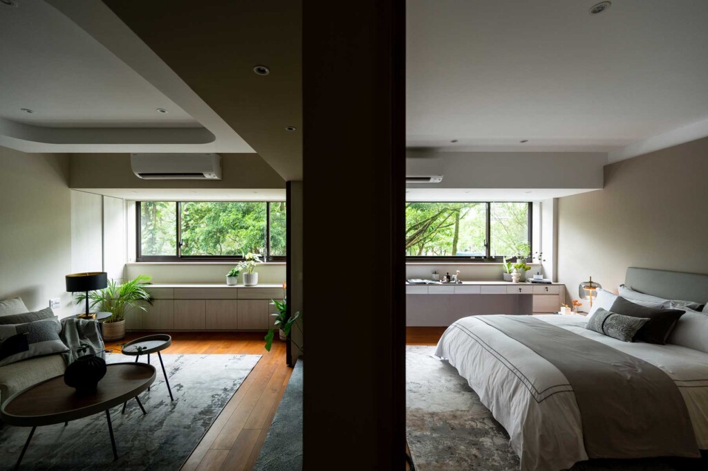 而天花板處精心布置兩道弧型折線設計,讓光線的傾瀉有如樹林之間的疏影,用以呼應窗外光景,不願過分張揚的極端值,為使視覺更為舒適,弧形的柔美搭配沉穩的色彩,相互陪襯亦相輔相成,構築出屋主專屬的完美居所。
