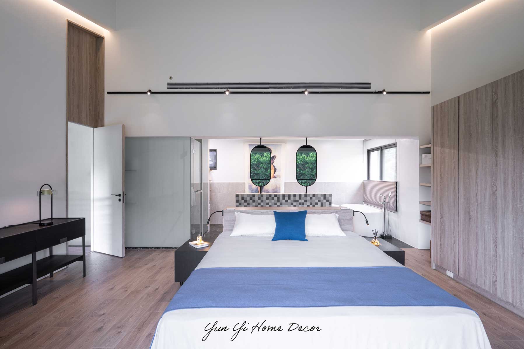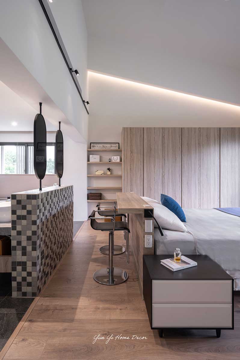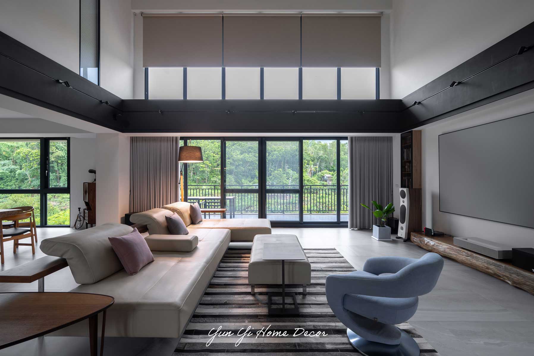 雖有良好的採光及視野但也希望同時能擁有完善的遮光效果。在窗飾的規劃上,因窗外是無限視野的山景,所以在客廳、廚房及臥室的大扇落地窗皆規劃全遮光蛇形簾,除了可全遮光外且外觀大氣美觀,另臥室半腰窗則使用上拉式全遮光風琴簾,以利恣意調整光源。挑高二樓則使用電動式遙控窗材開關。 在裝修規劃上是以質樸、原始的設計為主,所以在窗飾顏色選擇上是以灰色及奶茶色等淺色調搭配,降低屋內的彩度,襯托原木家具讓空間呈現一個層次感。窗飾在空間中面積最大,適當的選擇除了本身是主角外也可以成為一個襯托其他主視覺的配角,相輔相成,不可忽視。