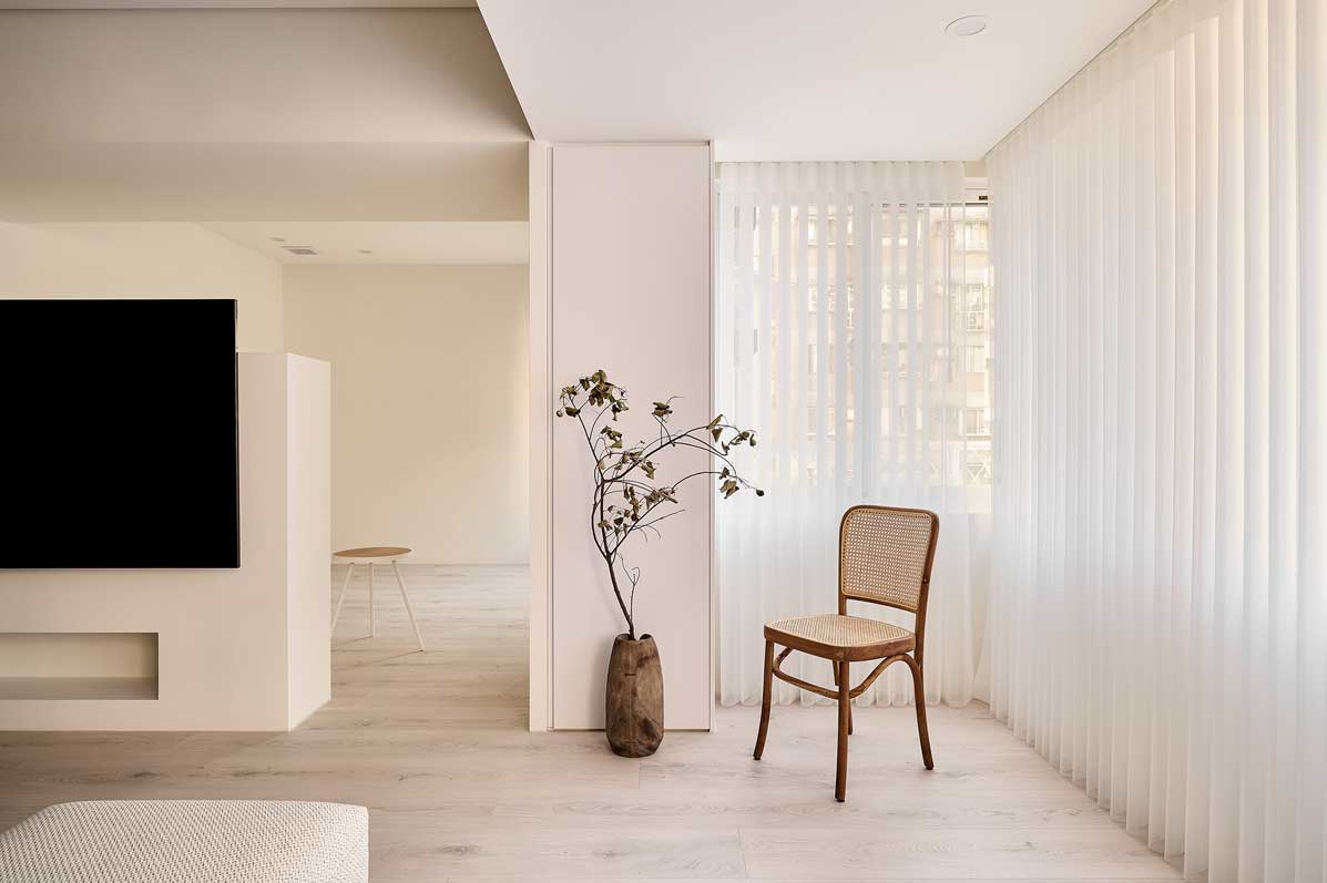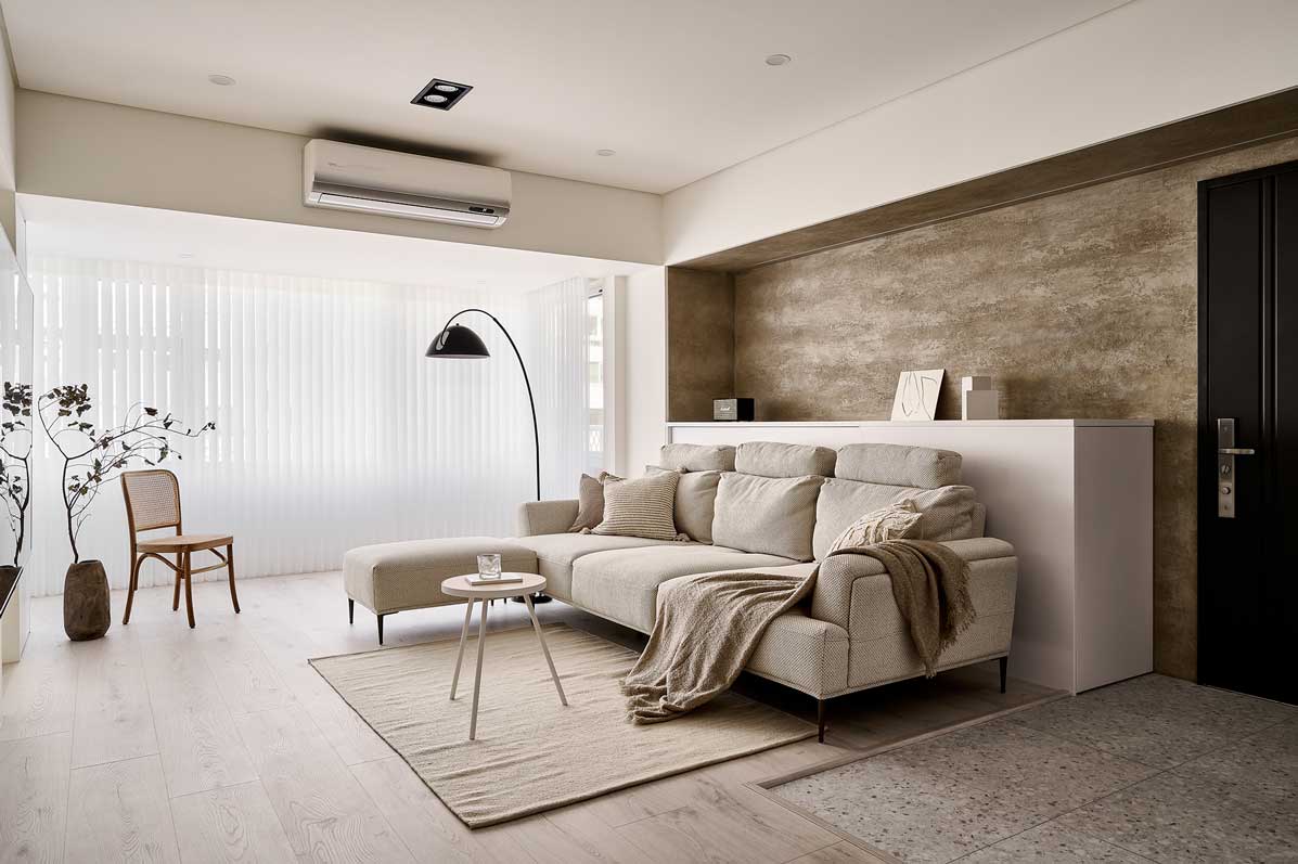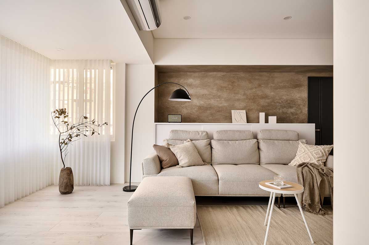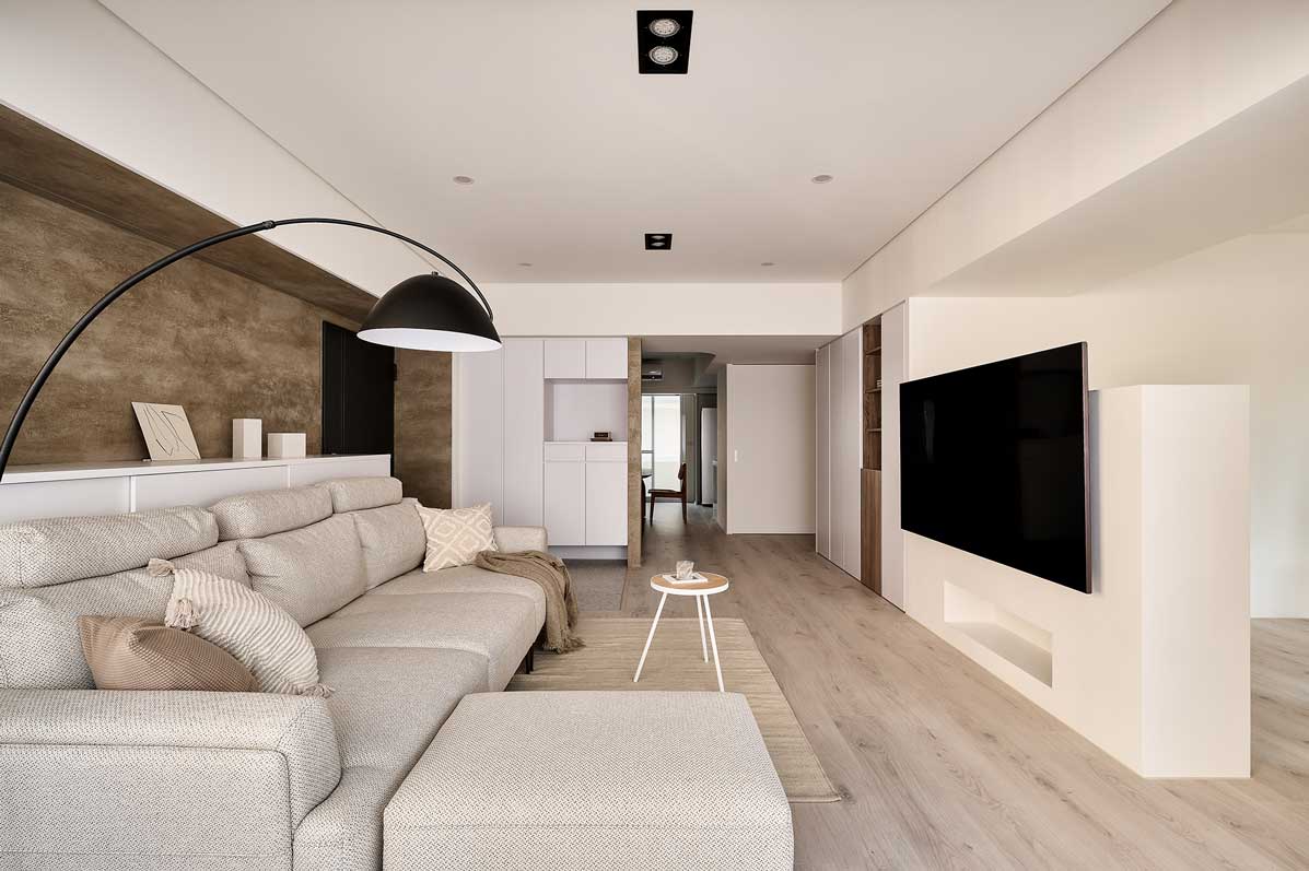 由於公共廳區需要納入佛堂規劃,又希望保持通透明亮的感覺,於是運用半高電視牆設計來區隔兩個場域。這座電視牆還有一個設計巧思,下方凹槽特別貼覆白色木皮,畢竟這裡是要放置設備的地方,使用木皮會比單純塗上油漆相對不容易出現刮痕或顯髒。