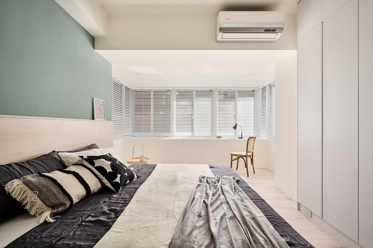 姊姊的房間除了白色和淺色木紋之外,床頭挑選莫蘭迪綠牆漆做跳色,簡單又不失變化。運用靠窗處原本就有的平台,滿足書桌和化妝桌的需求,該有的機能都有了,也打造出舒適寬敞空間感。