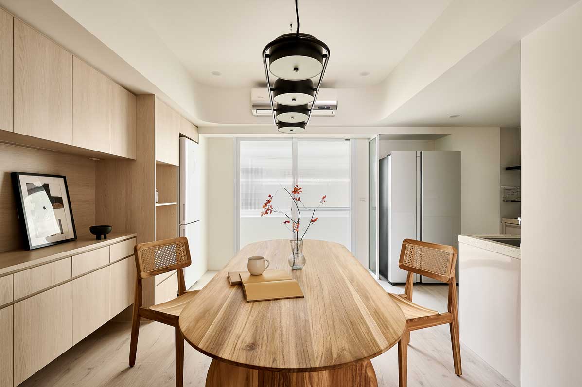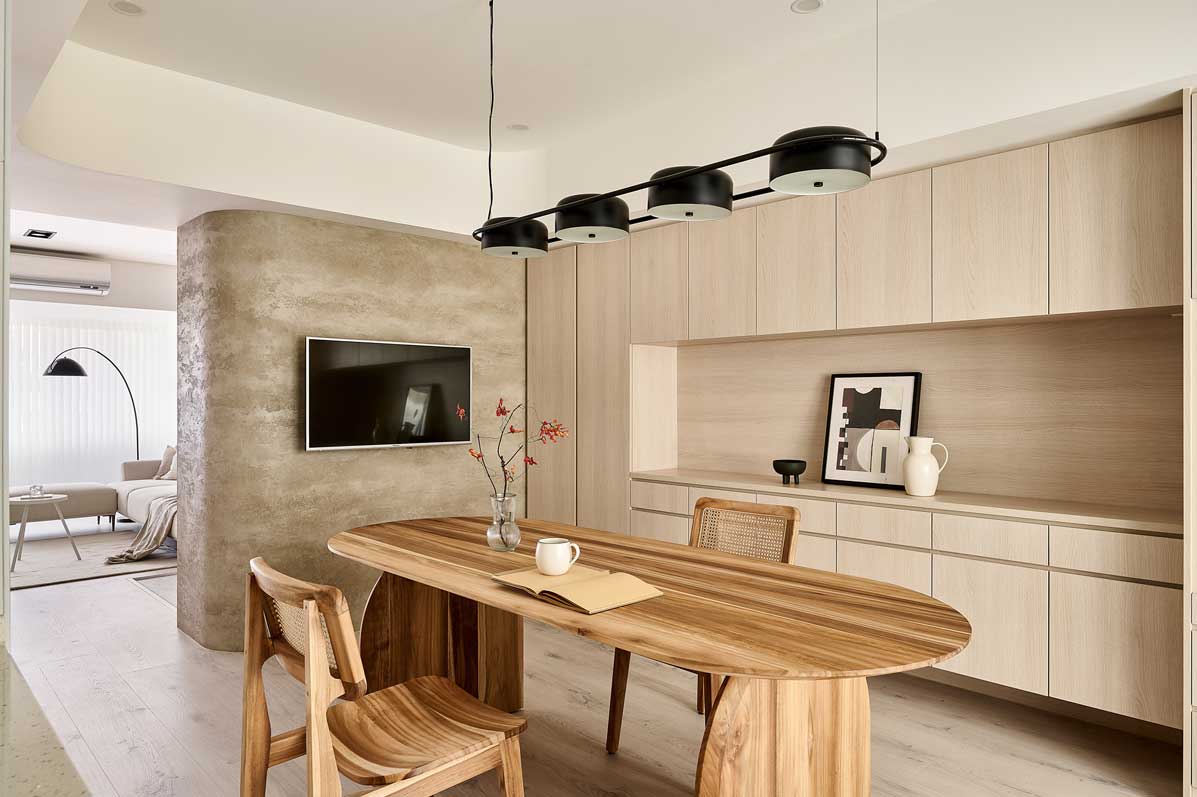 因平常較少熱炒,大多是簡單料理,所以廚房採開放式規畫,並把部分空間規劃成儲藏室。沿著樑下嵌入一整排餐櫃,將冰箱、電器櫃、集塵式掃地機器人加以整合,發揮強大的收納機能,搭配懸浮式設計減輕櫃體厚重感。為修飾空間中的大樑,天花板導入圓弧造型,和藝術漆主牆、餐桌、吊燈互為呼應,也讓視覺多了分柔和層次。