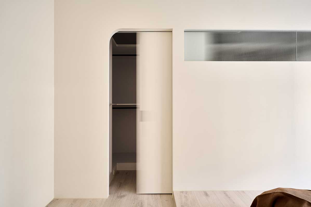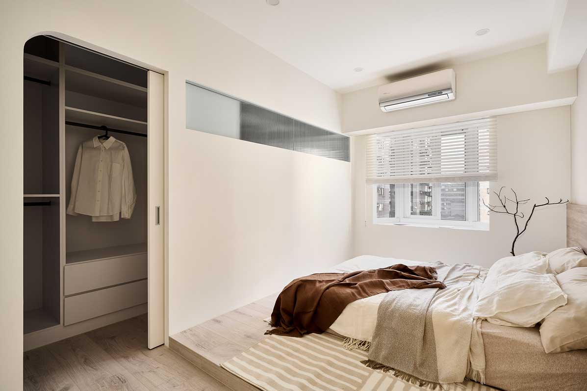 房間以簡約清爽為主,因為我的衣物量較多,所以以更衣室取代衣櫃。為了改善更衣室的採光,隔牆局部嵌入長虹玻璃引入光線。保留走道空間後,將剩餘地板稍微架高,如此一來如果要增加床鋪也很方便。