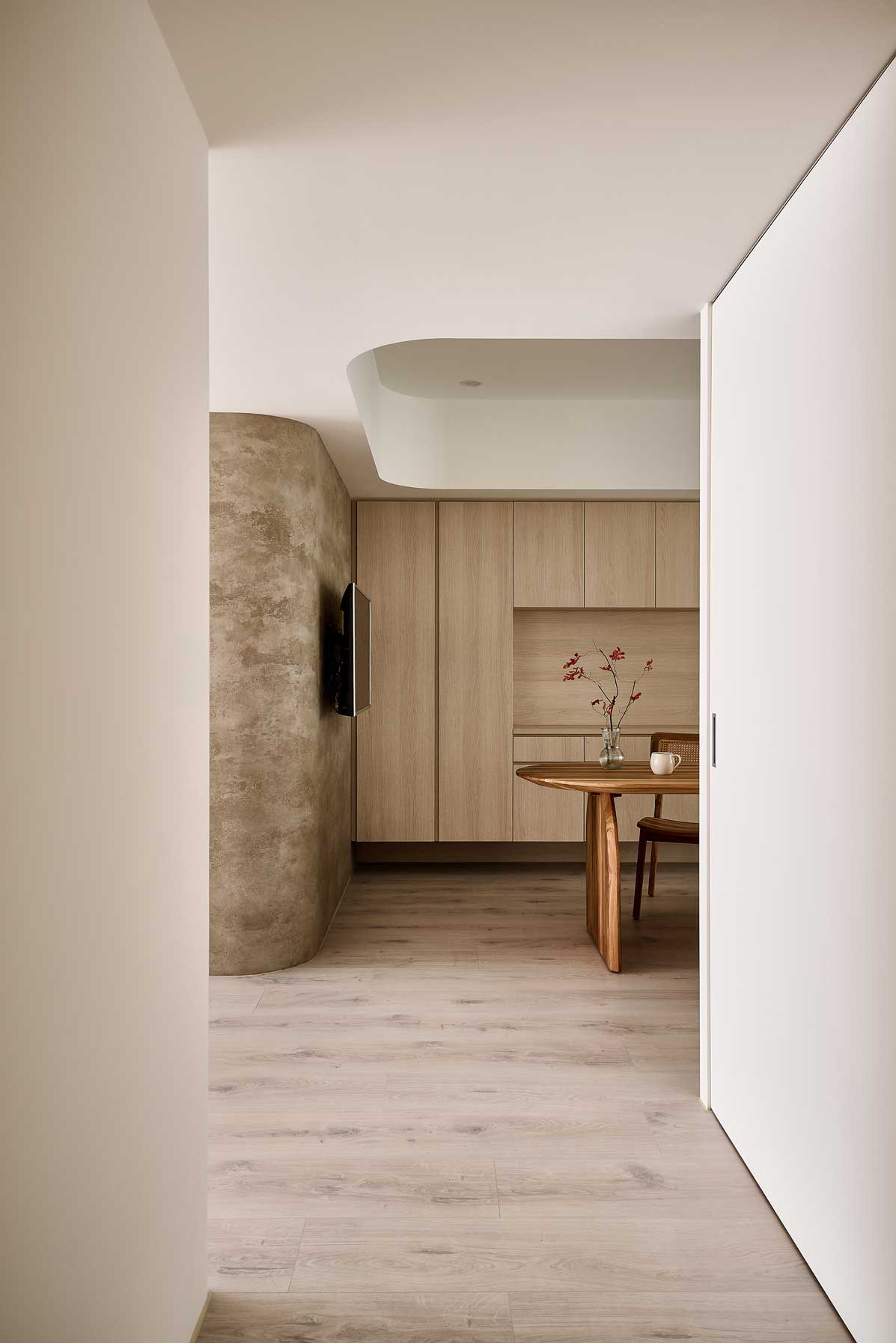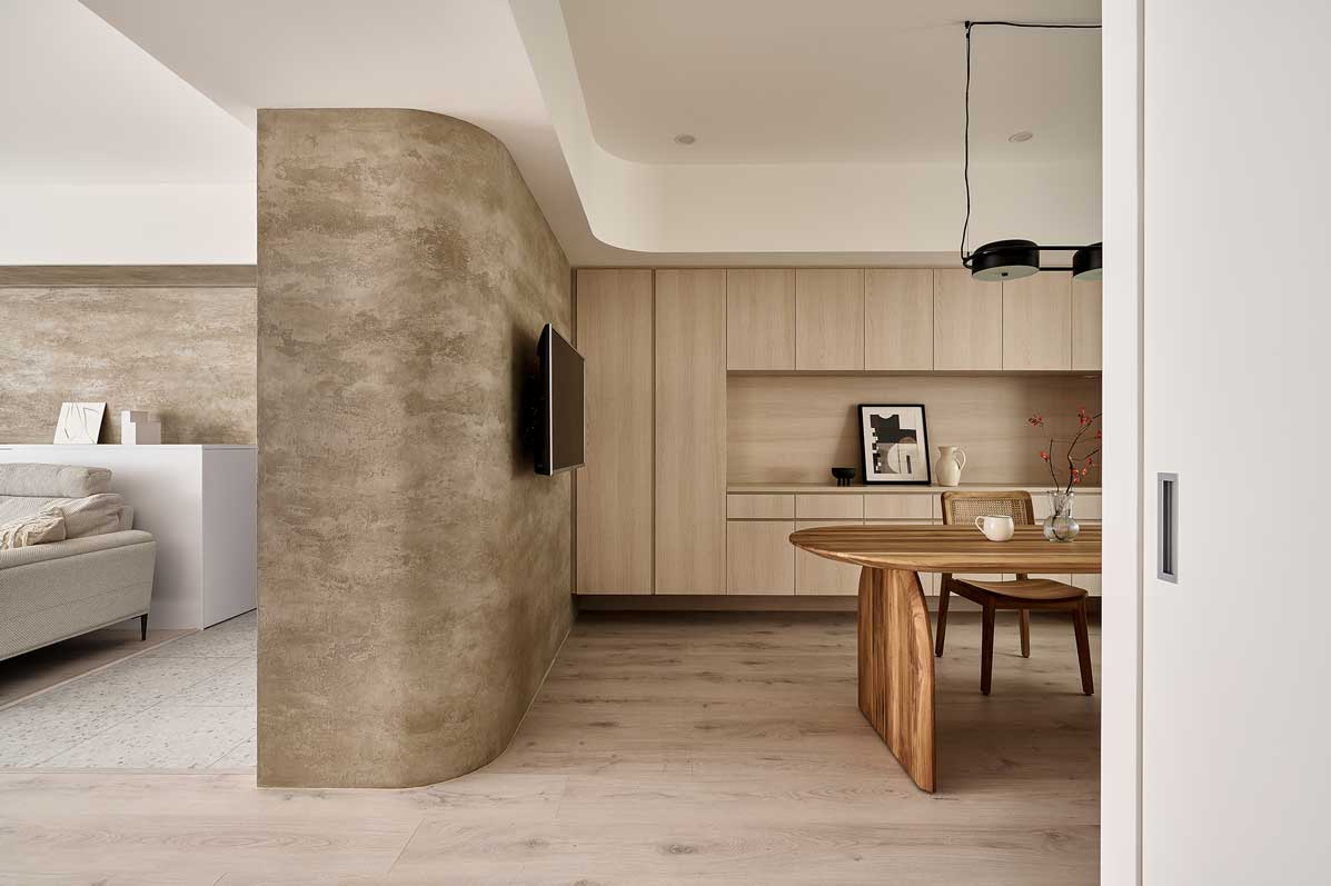 大門入口地坪鋪貼水磨石磁磚,劃分出落塵區,並在左手邊新設懸空白色櫃體,提供鞋櫃、置物平台和汙衣櫃功能。因櫃子的背側就是餐廳區,便改用弧形牆面搭配藝術漆,成為餐廳區的視覺主牆。