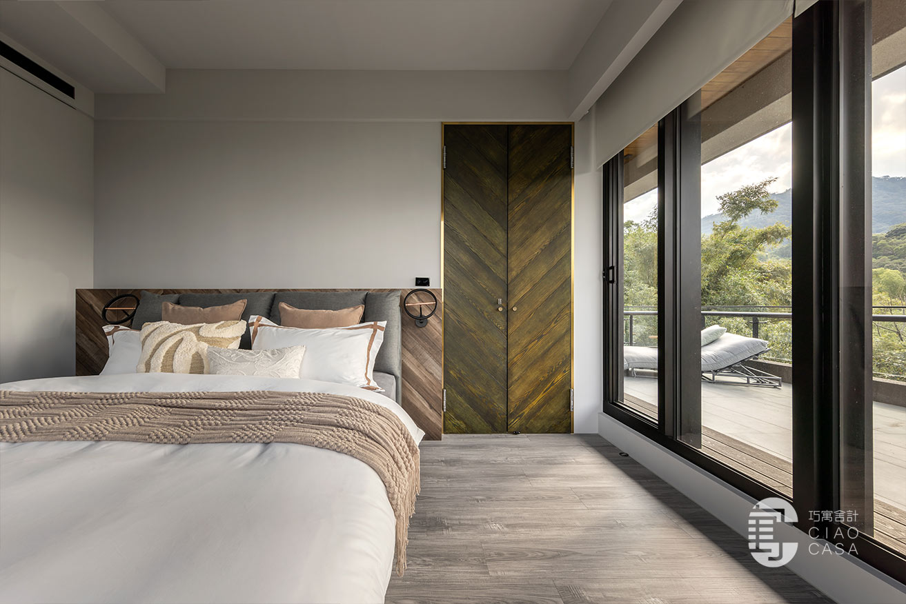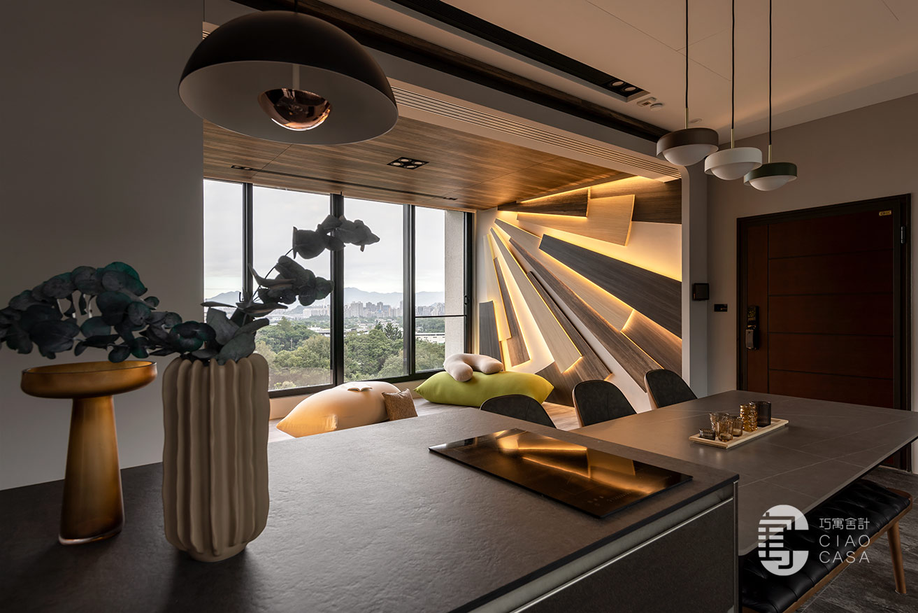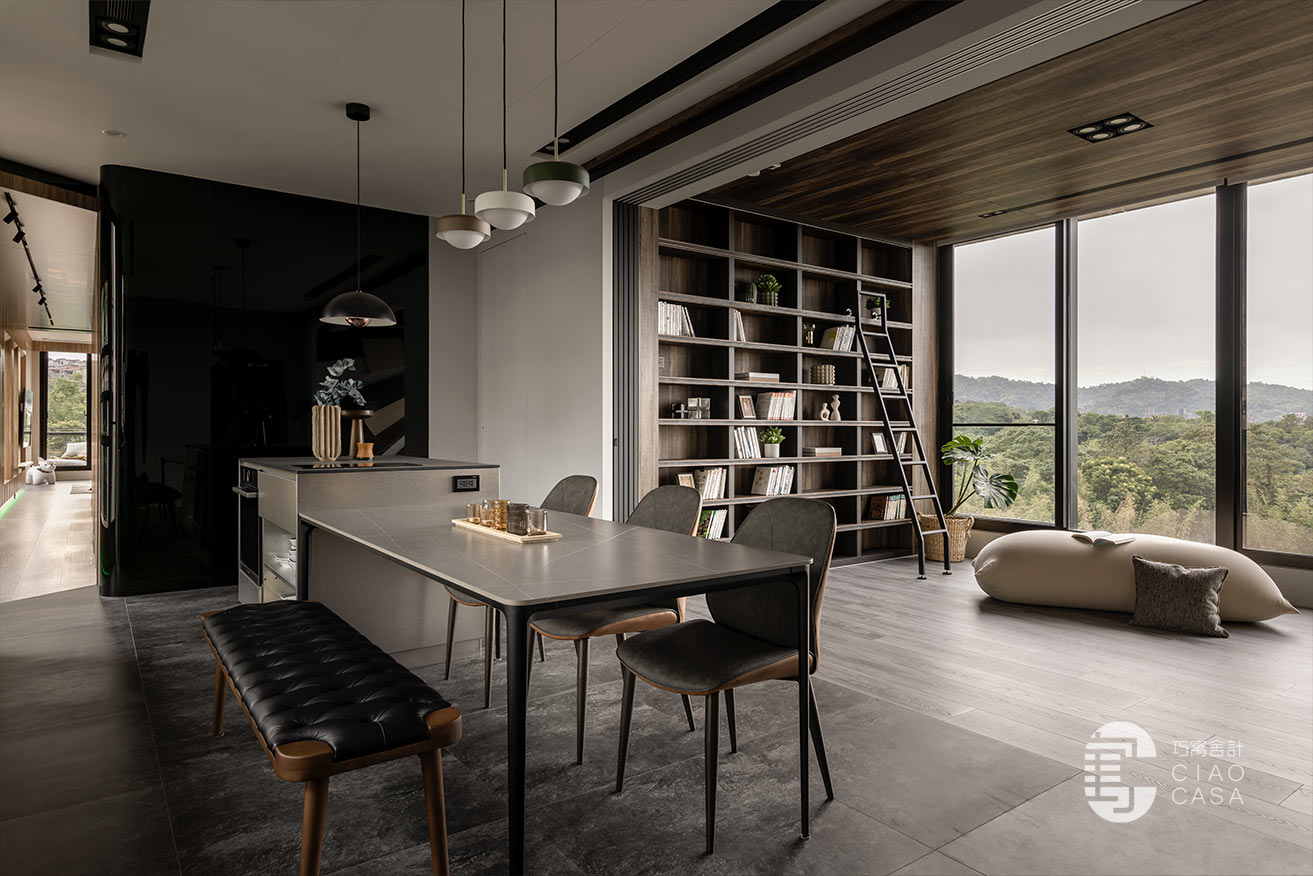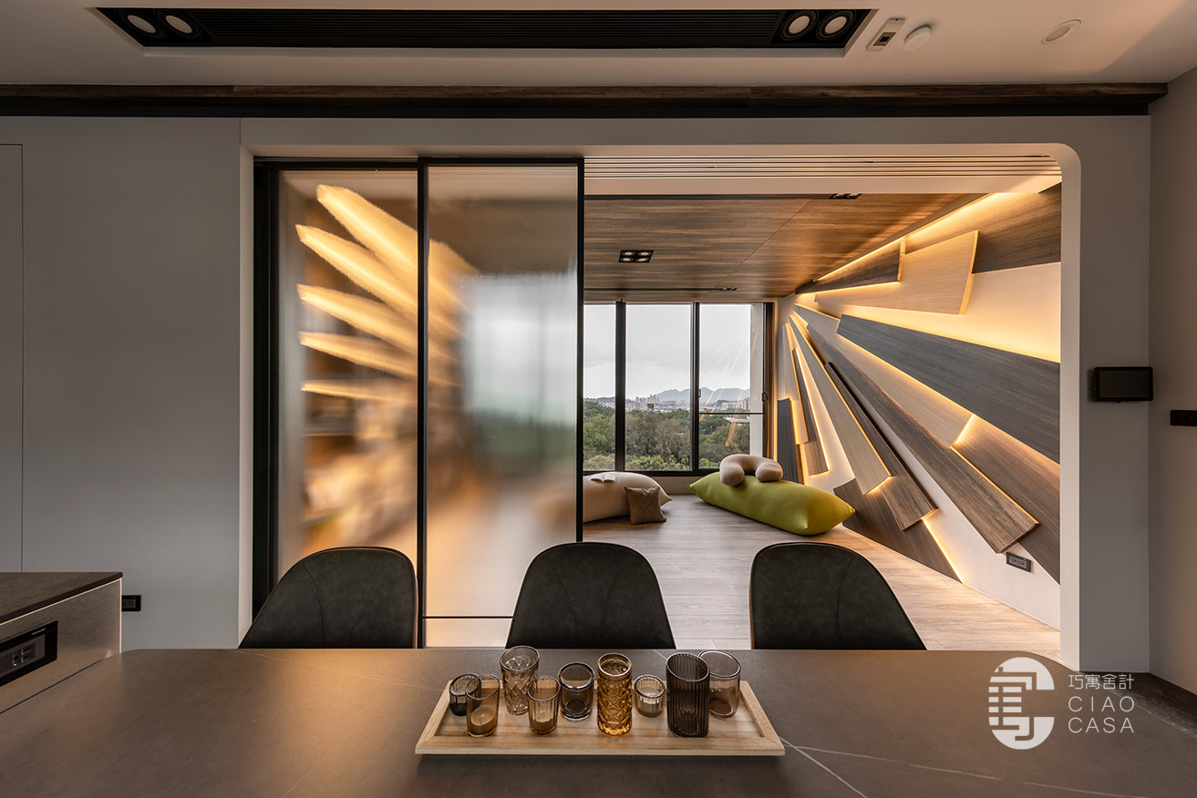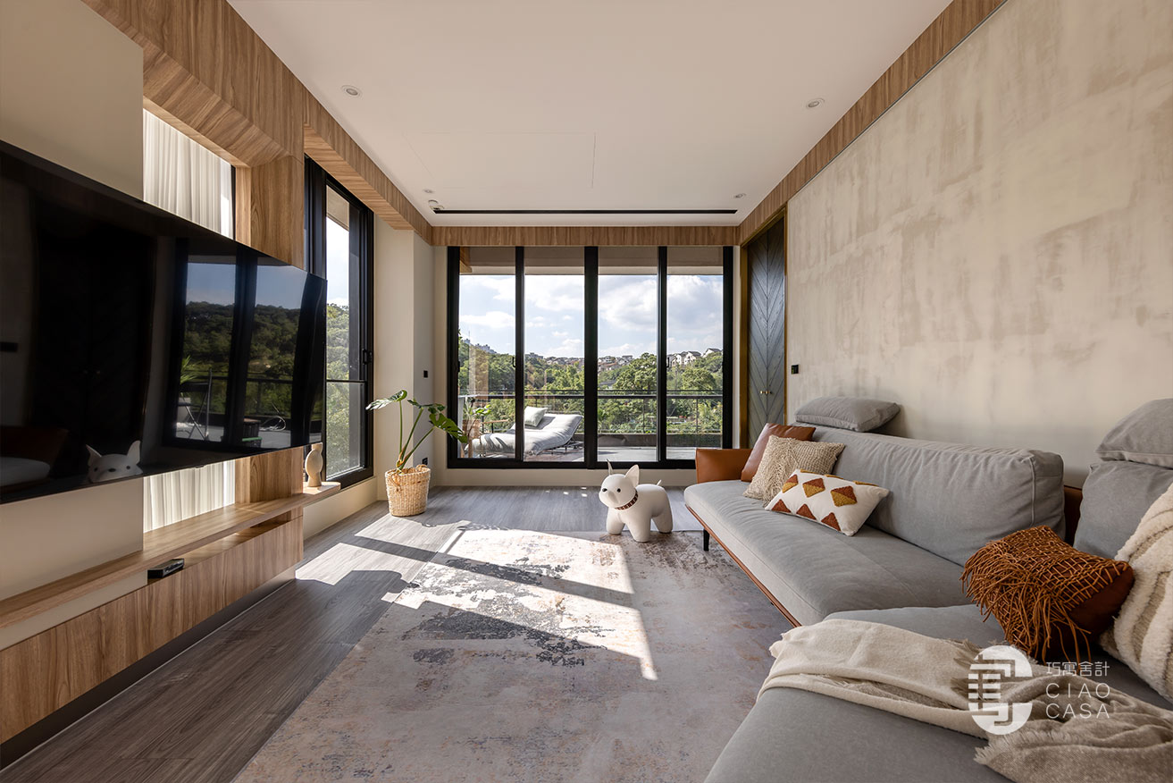 設計師以陽光走廊做為分界,將公私領域區分開,以廚房與多功能室做為家的中心,大面積落地窗外的綠景,帶入屋中,建構處處是景的森林系休閒宅,每個角落都有它的故事,每一束光線都有它的溫度。