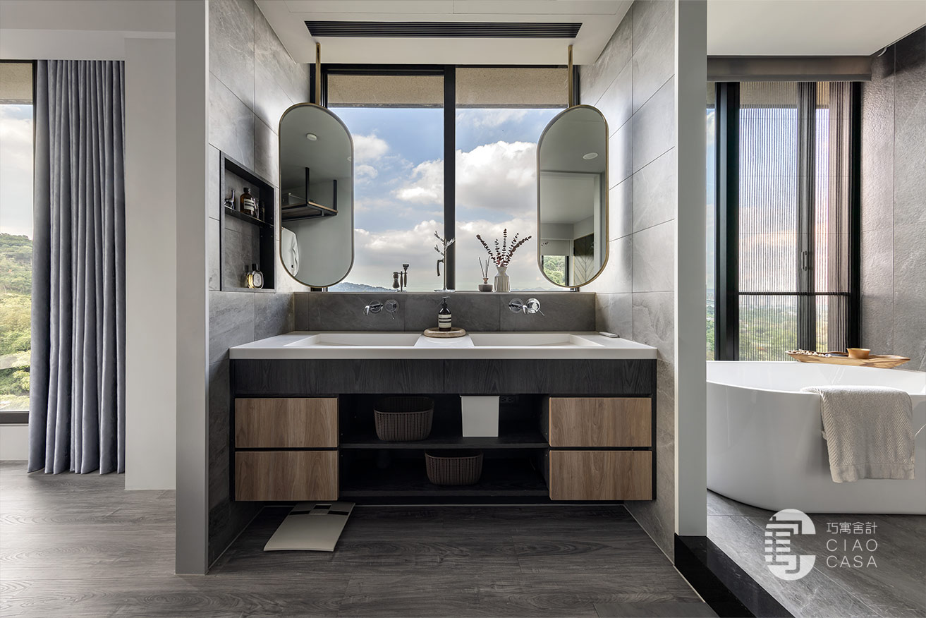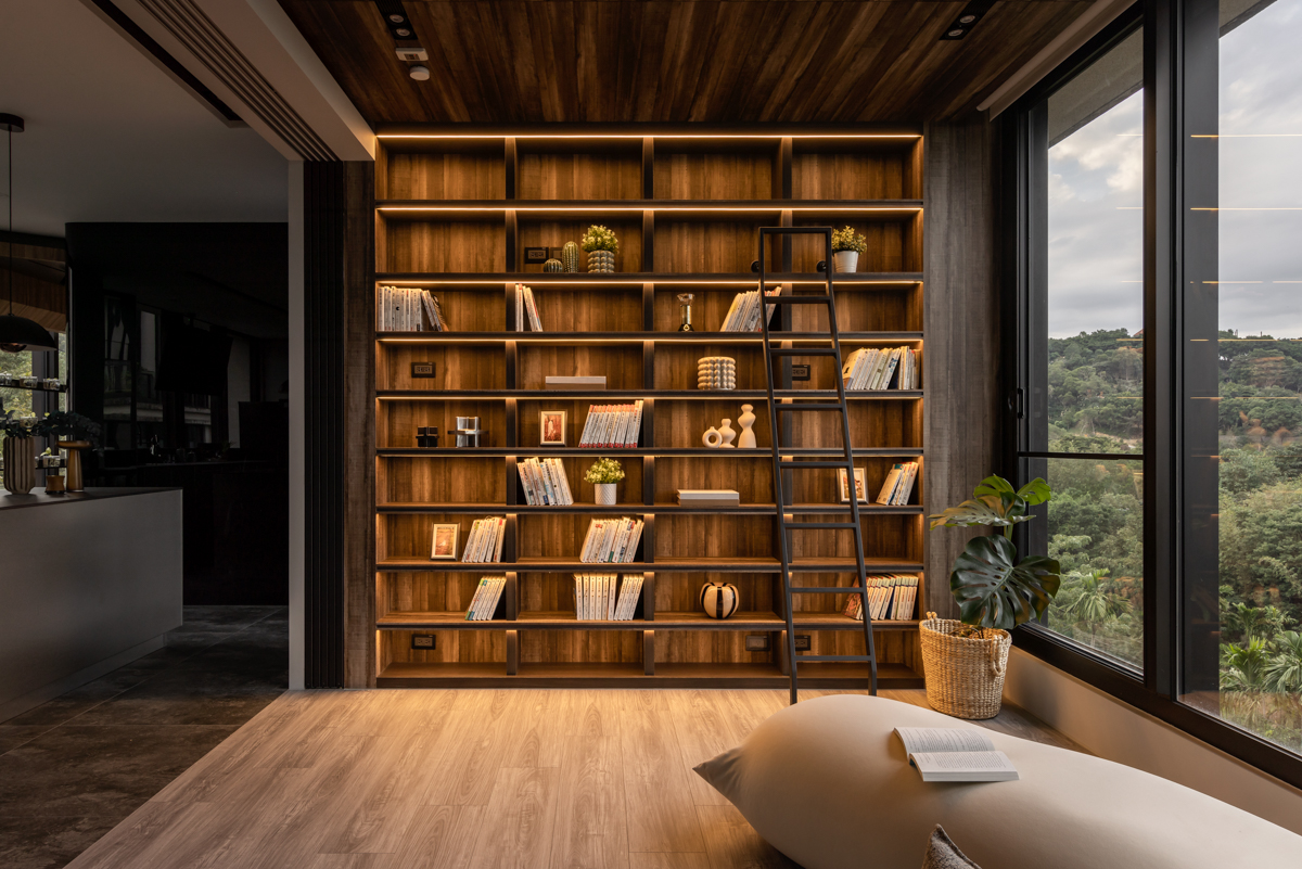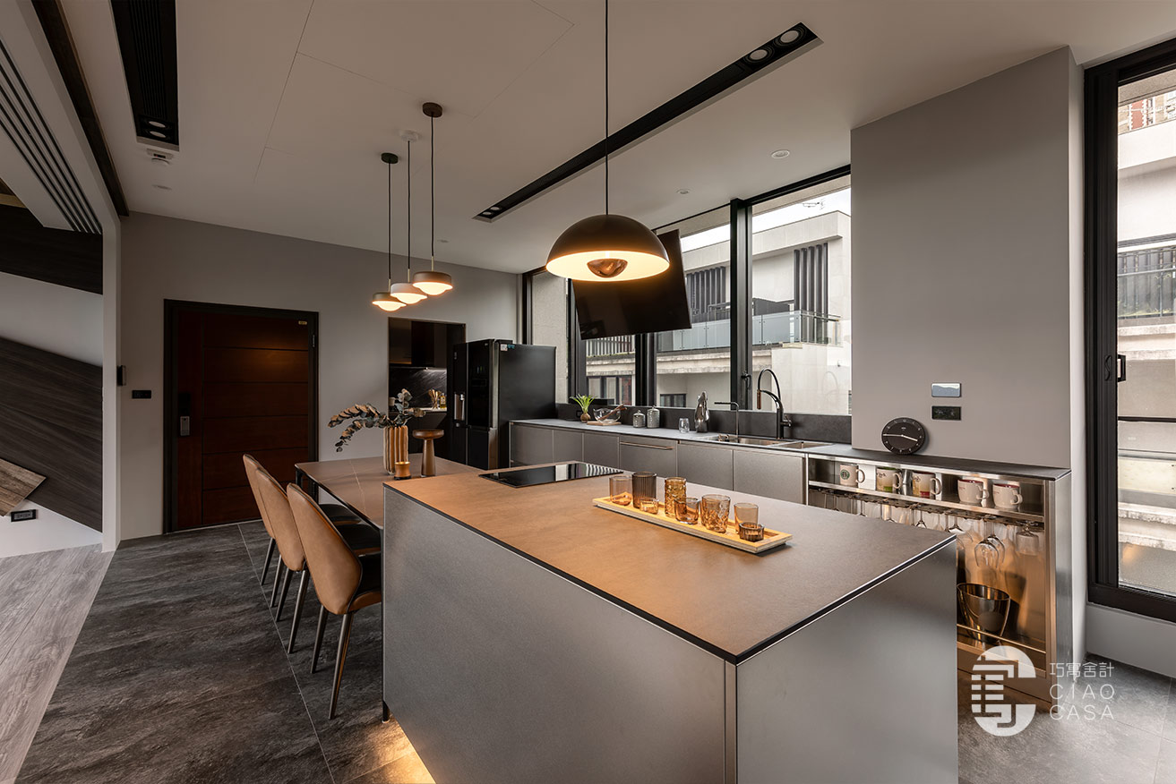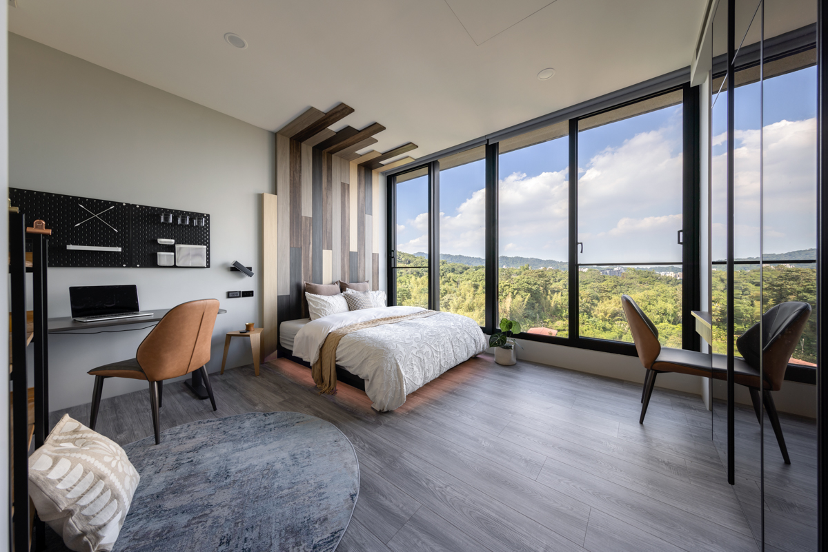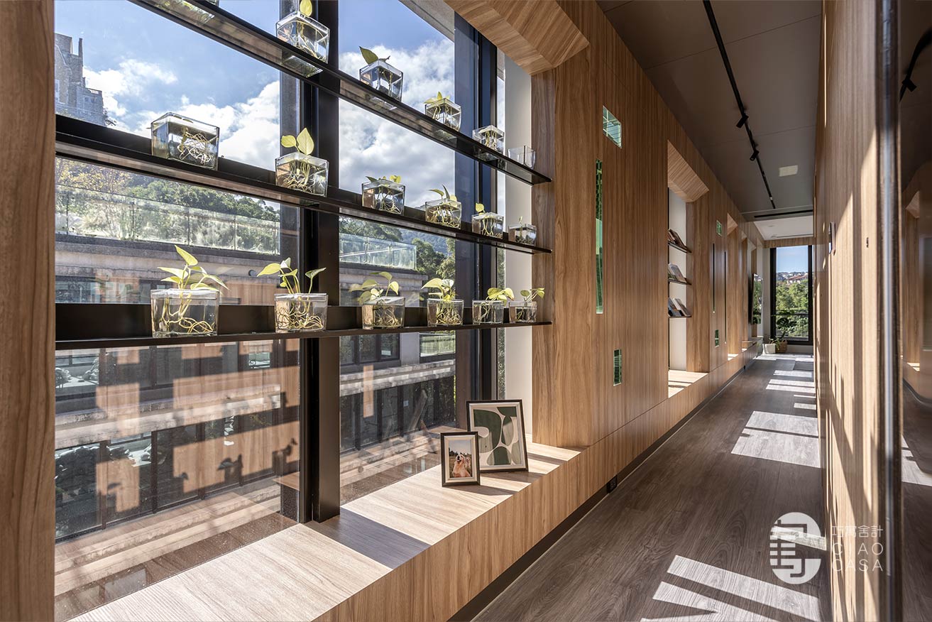 設計師以陽光走廊做為分界,將公私領域區分開,以廚房與多功能室做為家的中心,大面積落地窗外的綠景,帶入屋中,建構處處是景的森林系休閒宅,每個角落都有它的故事,每一束光線都有它的溫度。
