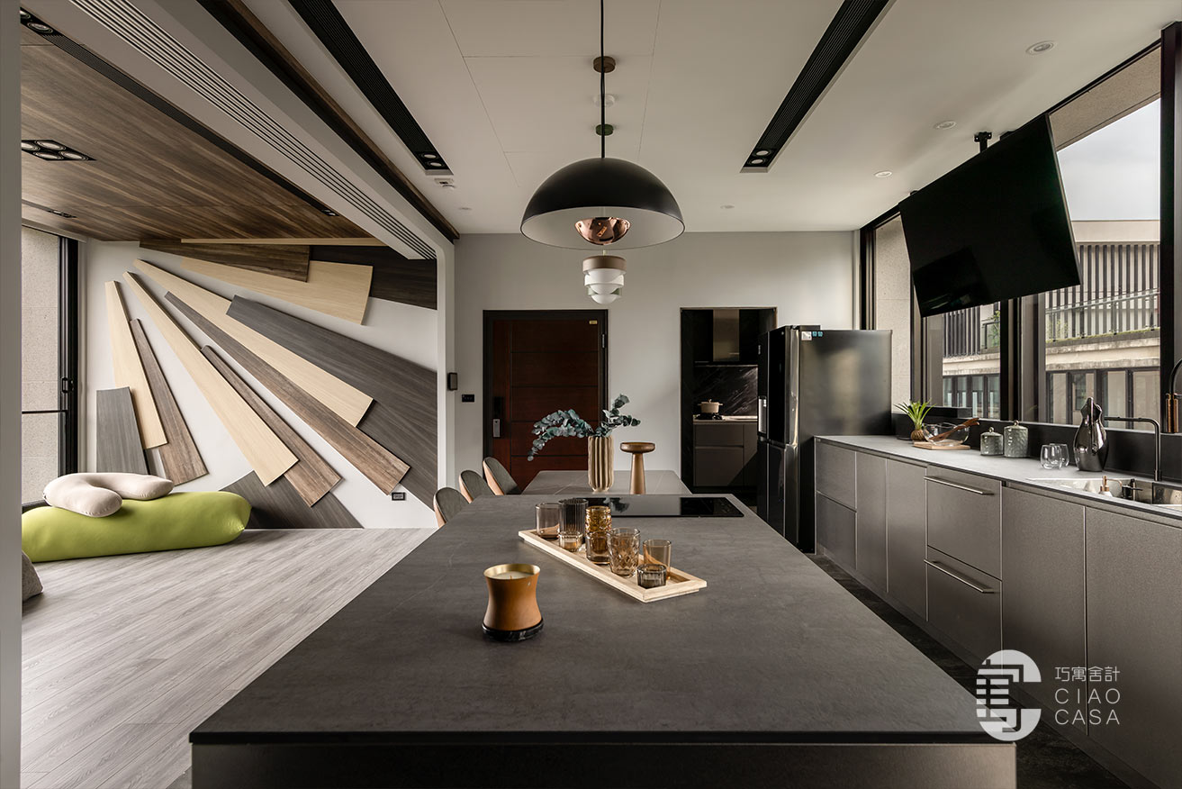 綠建材系統傢俱、複式造型天花板、木格柵造型門、鍍鈦門框、藝術塗料、海島型木地板、義大利石英板、智能開關、鋁框拉門、霧面玻璃