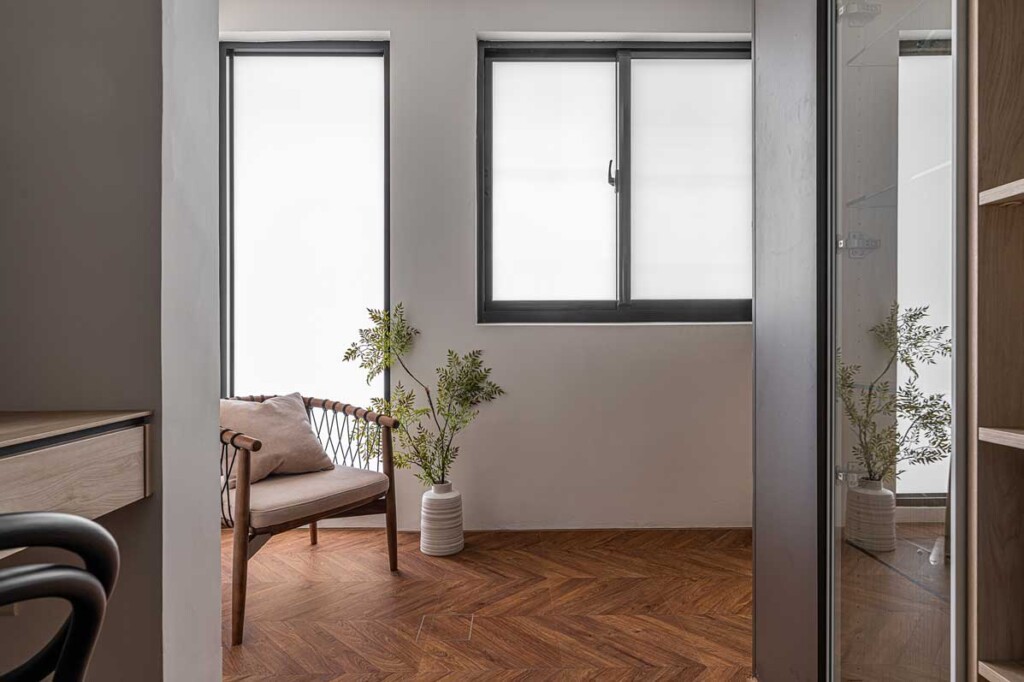 家的溫度,從廚房開始醞釀。磨石子檯面的長型中島 成為空間核心,好友相聚聊天的場域。鄰近的書房坐落在陽光最充足的一隅,透過重建平面格局跟門窗開口,讓廚房、餐聚空間與書房在視覺與光線上相互交融。