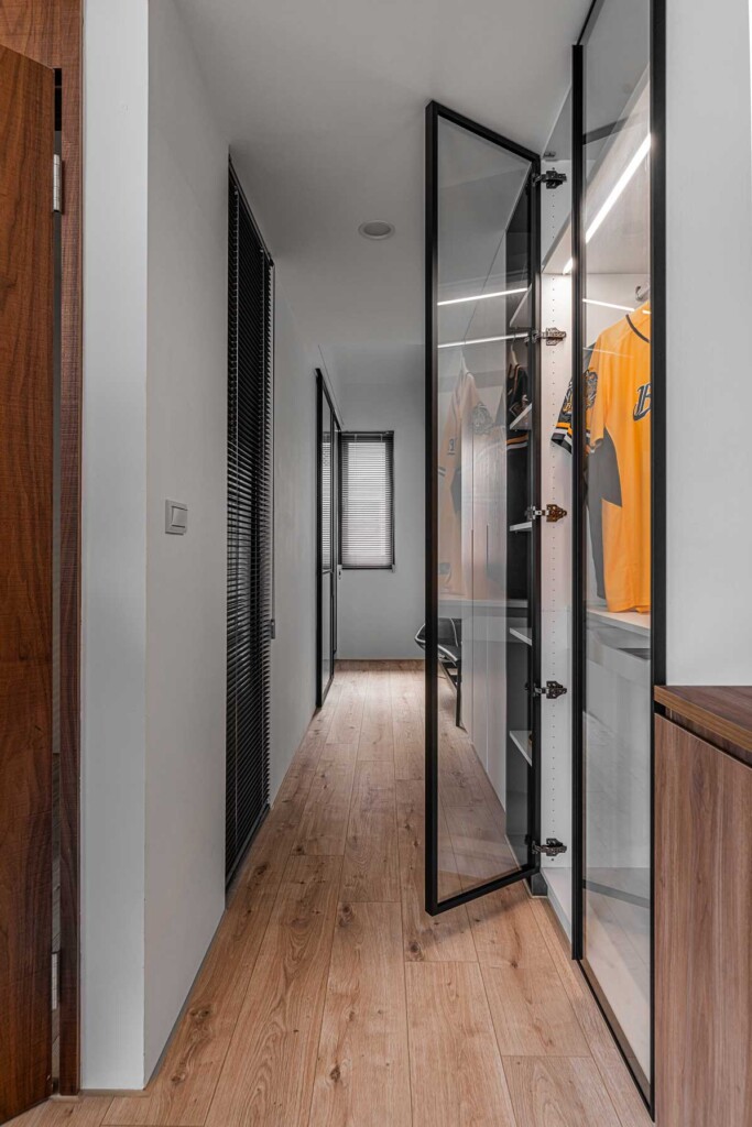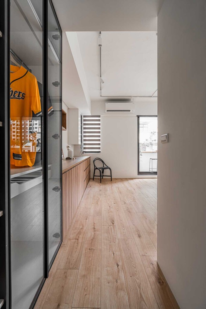 飛行的終點,是最安心的降落。主臥室如頭等艙般開闊,風格延續自然木紋,讓溫潤與沉穩在此交融。透明展示櫃中珍藏的棒球球衣,訴說著熱血與回憶。