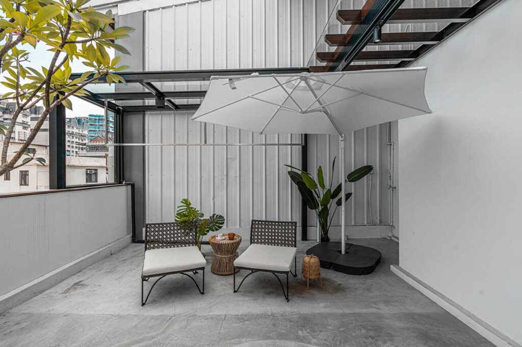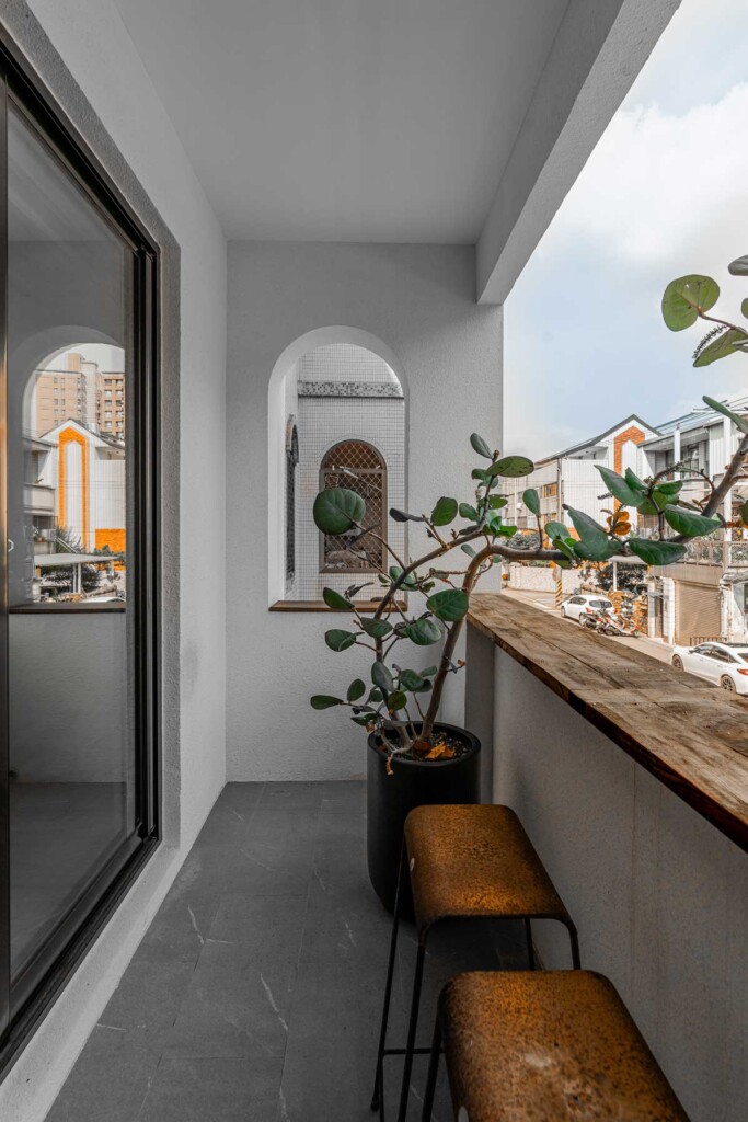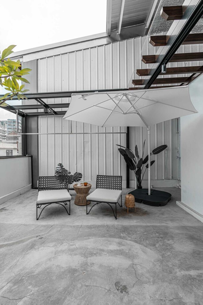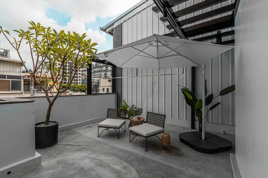 仰望星空的時刻。頂樓陽台拆除原有加蓋,設計為開闊的露台,讓夜晚的微風輕拂,星光自在灑落。 躺在夜色中,仰望星空,如同航行於靜謐的高空,讓心境沉澱,讓思緒遠行,回歸生活最純粹的節奏。