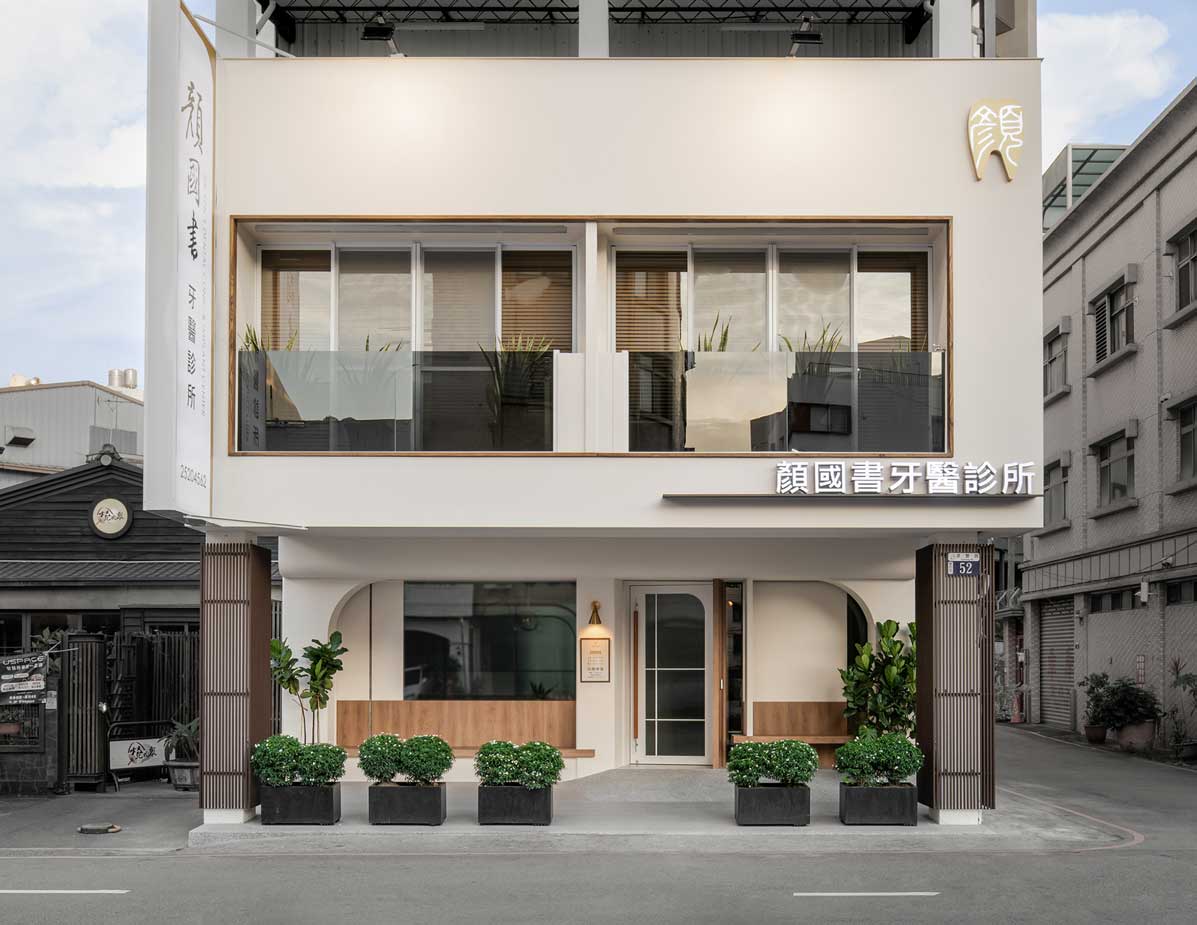 一般牙醫診所的門面多以直線條為主,容易顯得生硬與距離感。本案則運用弧形元素,弱化垂直與水平的剛硬線條,使外觀更顯柔和且親和力十足。入門口刻意脫離主牆並旋轉一定角度,避免入口直接面對馬路,提高隱私性與安全感。