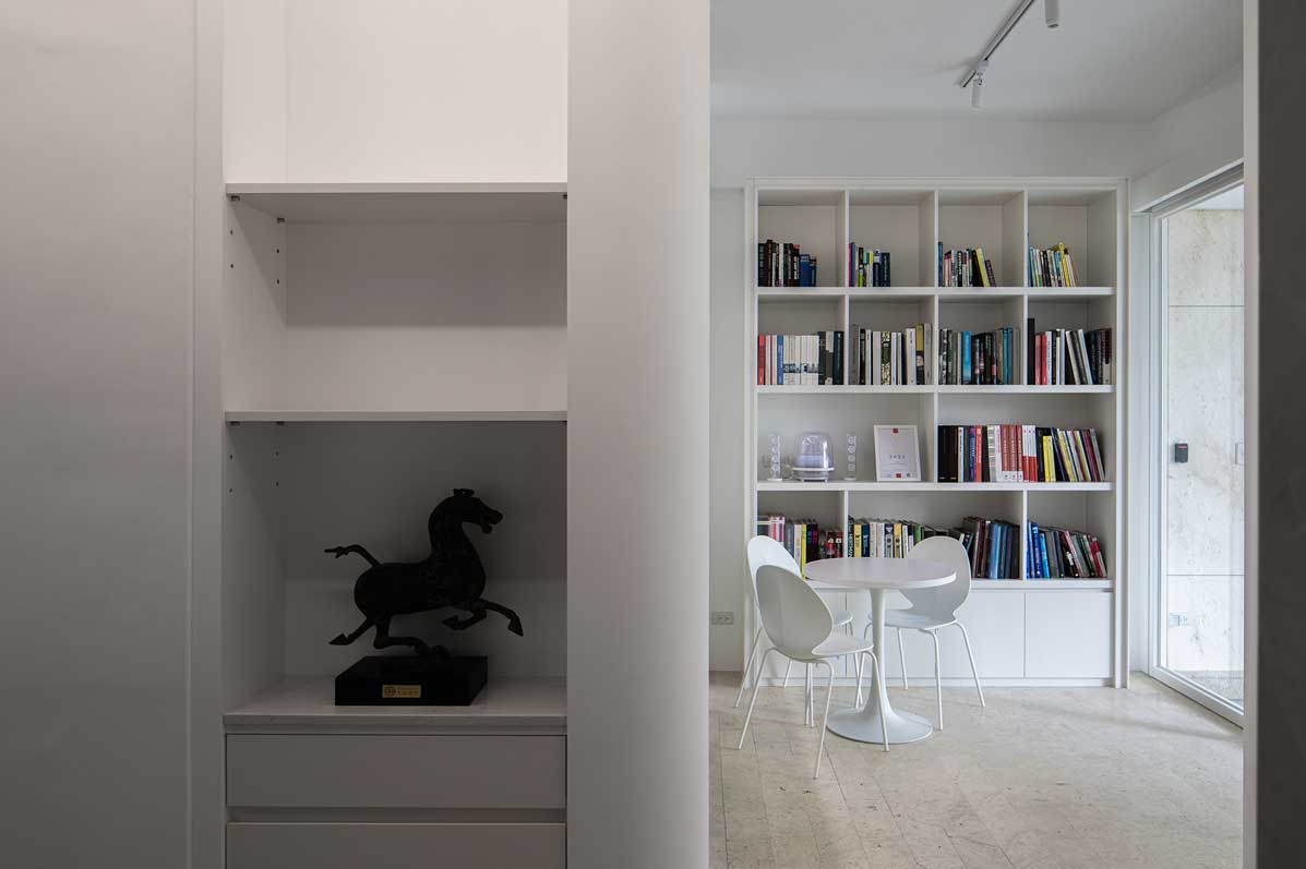 整體室內空間色調選定白色,搭配灰色塗料及米色馬賽克磁磚、石材,讓室內產生和諧感,原有半腰窗戶降低檯度,前後院綠化造景,使戶外植栽是可親近,創造放鬆減壓的辦公場域。