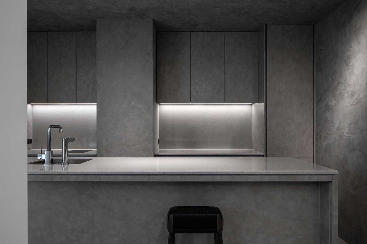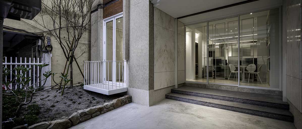 這是河畔巷弄的一幢老建築,設計上保留米色馬賽克外觀建築,加入新的磨石子和大理石材質,透過色調比例分割的細節,新舊兼融為一體。
