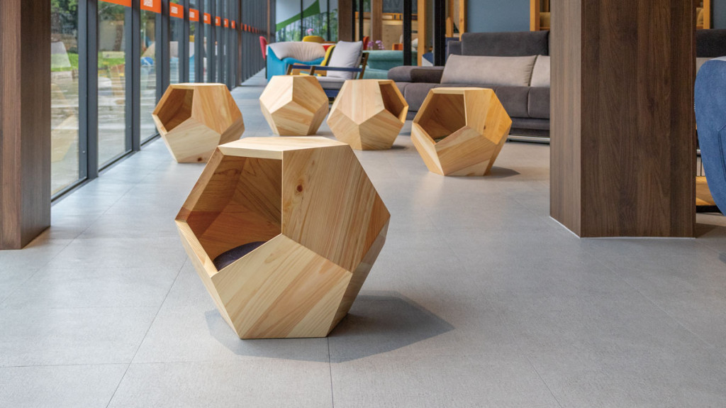 蜂巢邊几:以多個五角形組成類似蜂巢的外觀,在匠人細膩處理之下,可藉由翻轉擺放變化多種用途,附上軟墊增加寵物休憩舒適度,也可取出單獨使用。(歐得葆家具)