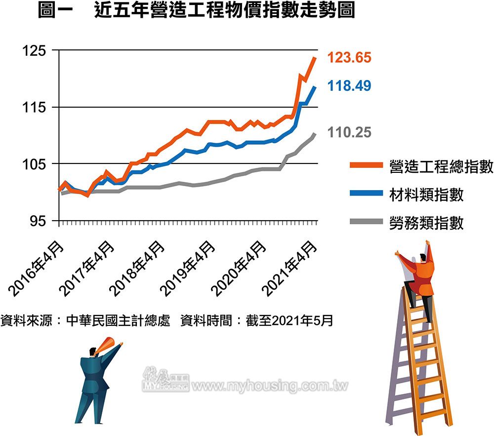 業者口中提到的營建成本上漲,到底有多明顯?最直接的,就是參考主計處逐月公布的營造工程物價指數(詳見圖一)。在營造工程物價總指數方面,二〇二一年四月較去年同期增加了九.一%,其中勞務類指數增加六.〇五%,材料類指數更是增加了一〇.九六%,而且,無論是總指數還是分項指數,年漲幅都是五年來最高,且高出不少。