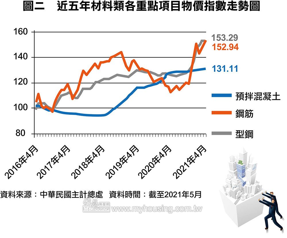 截至五月中旬,國內鋼鐵大廠豐興,鋼筋的價格已經連續八週上漲,且最近一次的漲幅更高達四%,為近年罕見。對於營建相關產業而言,具重要地位的鋼筋及型鋼,每公噸分別已漲至二.二四及二.七萬元。觀察主計處公布的營造工程物價指數,鋼筋、型鋼近一年內的漲幅,更分別高達三六.一八%及二一.〇二%。