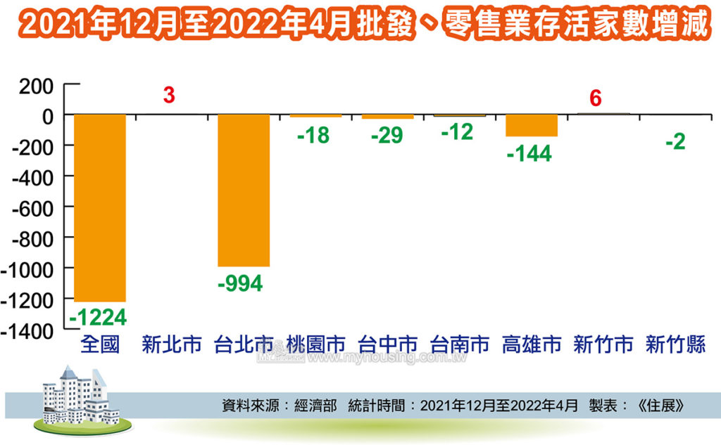 以受災程度最大的批發及零售業為例,今年來存活家數竟出現「倒退櫓」,家數不增反減;在短短四個月內,全國存活家數由九八八○八家降至九七五八四家,減少了一二二四家,顯示疫情對批發及零售業產生致命傷害。