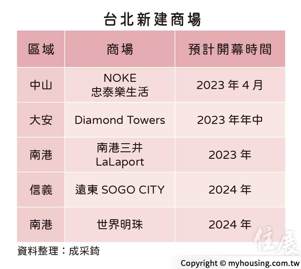 接下來,台北還有遠東SOGO CITY、南港三井LaLaport等新建商場將陸續開幕,其中Diamond Towers(鑽石塔)及NOKE忠泰樂生活,都緊鄰既有百貨公司。