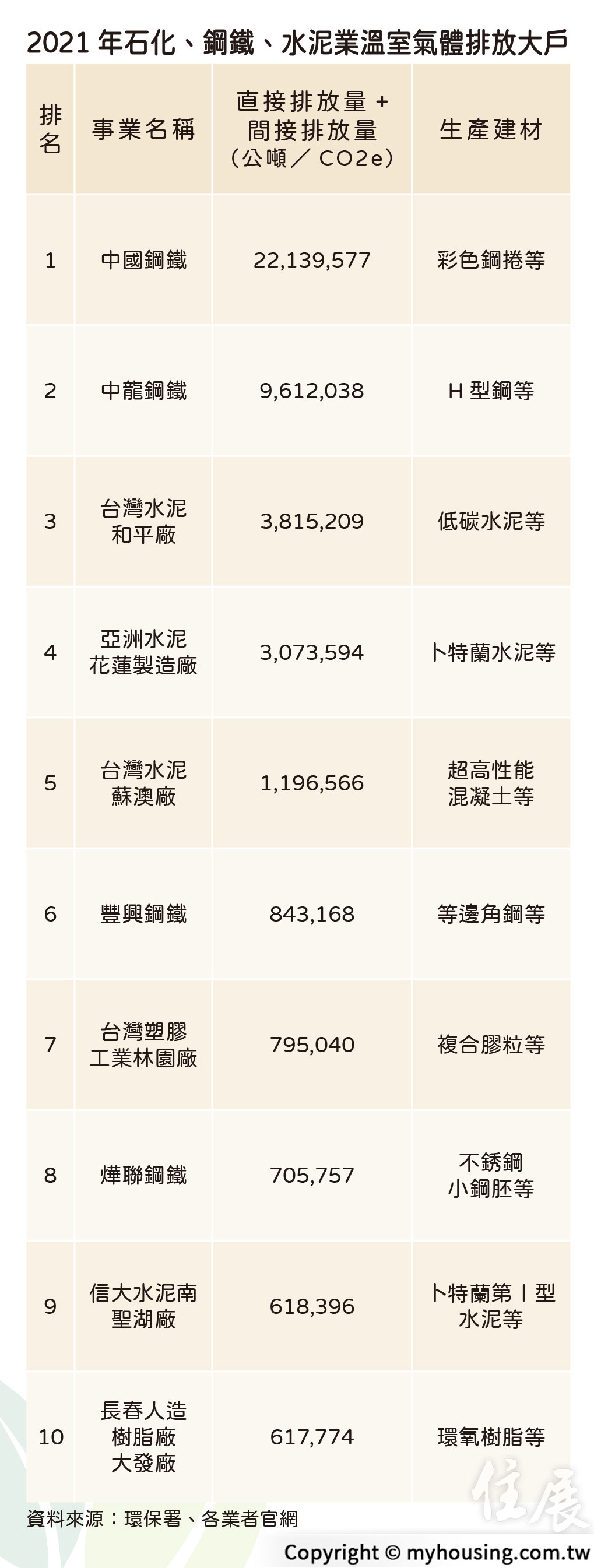 根據環保署發布的2021年溫室氣體排放量資訊,應盤查登錄溫室氣體排放量排放源的石化、鋼鐵、水泥業者中,中國鋼鐵、台灣水泥、台灣塑膠等四十四個事業體,年度直接、間接排放量總和超過3.5萬噸CO2e。