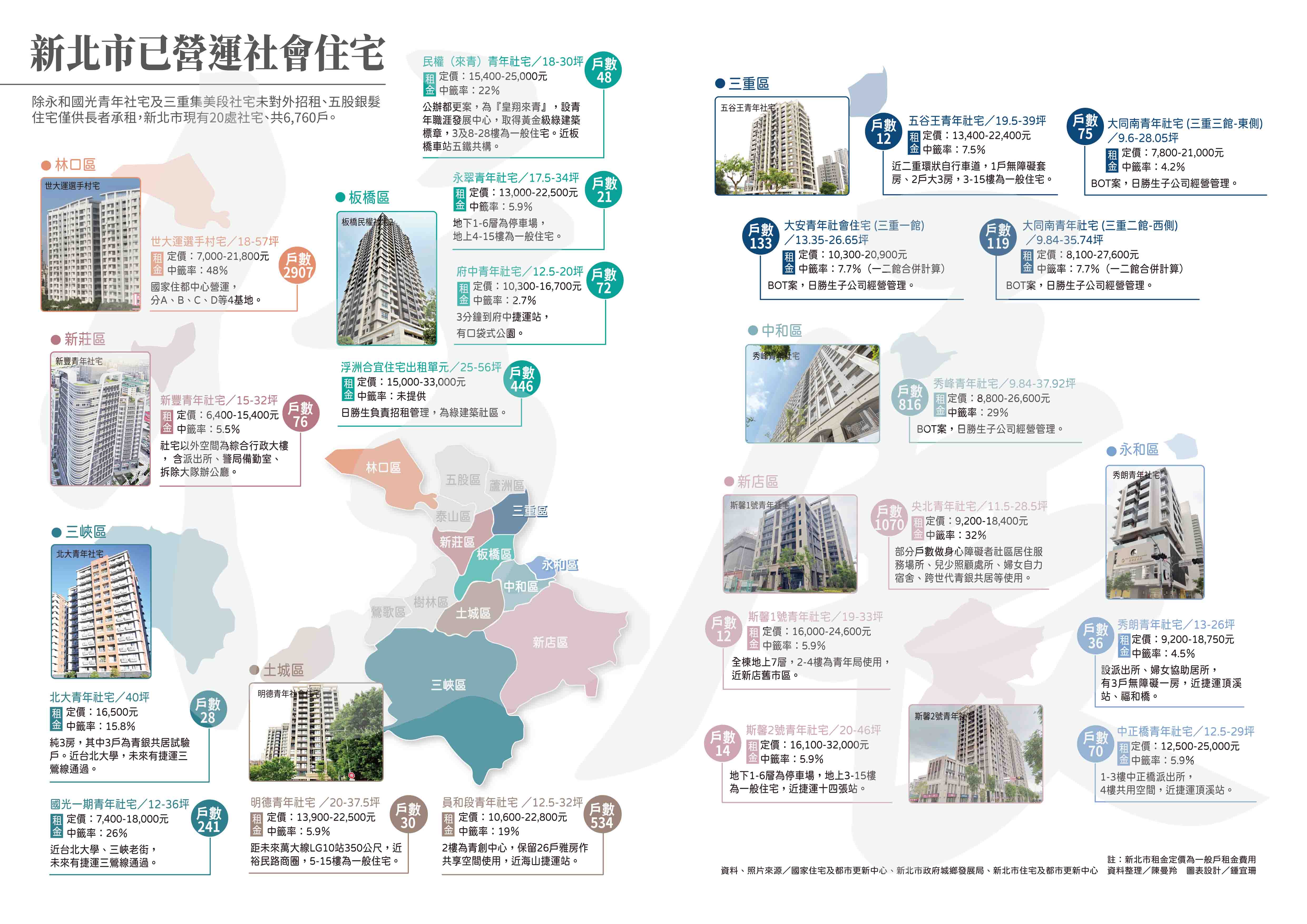 新北市租金最高者為浮洲合宜住宅56坪房型3300元,其次為斯馨二號青年社宅46坪3200元及三重二館青年社宅約36坪27600元;租金最低者為新豐青年社宅15坪只要6400元,其次為世大運選手村社宅18坪7千元及三峽國光一期青年社宅12坪7400元。