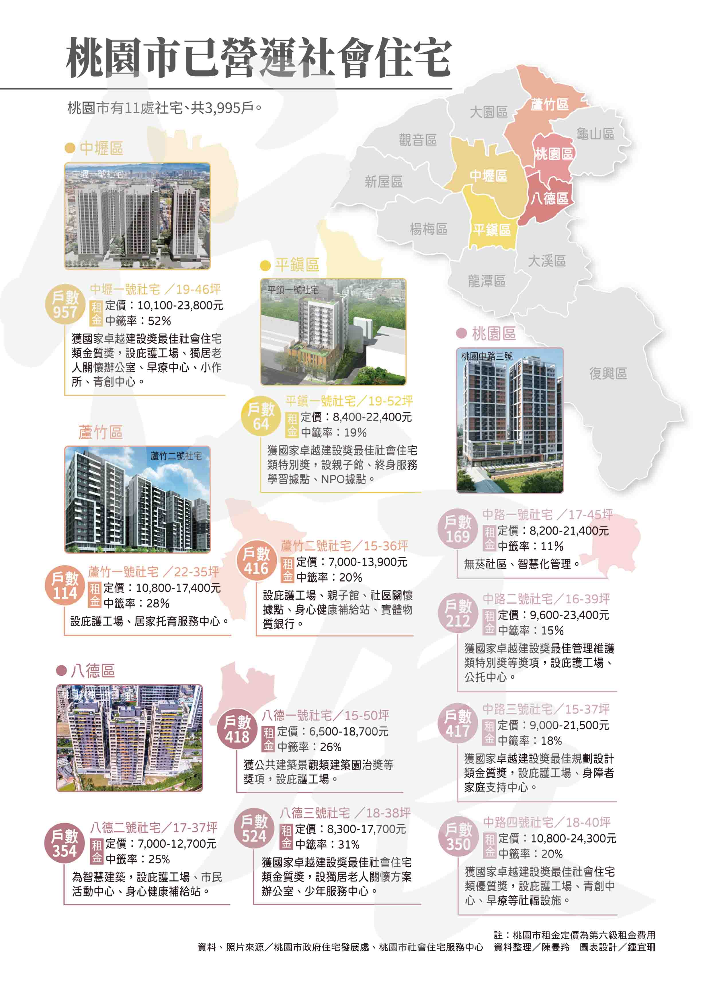 桃園市多數社宅獲得國家建設獎各式獎項,並設庇護工場等社福設施,落實照顧弱勢及長者。