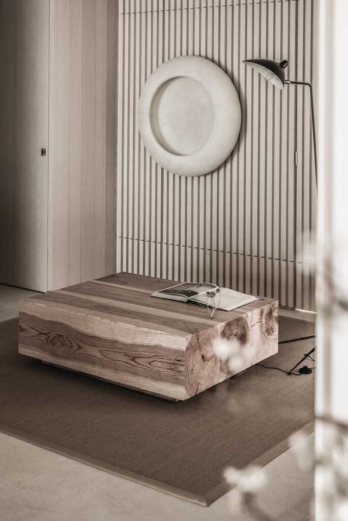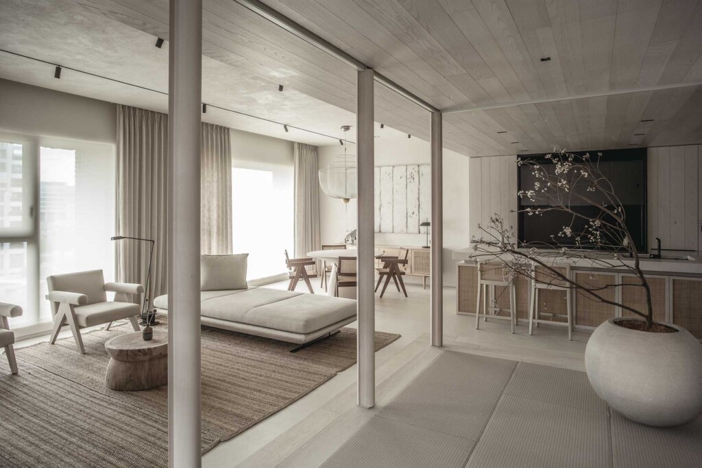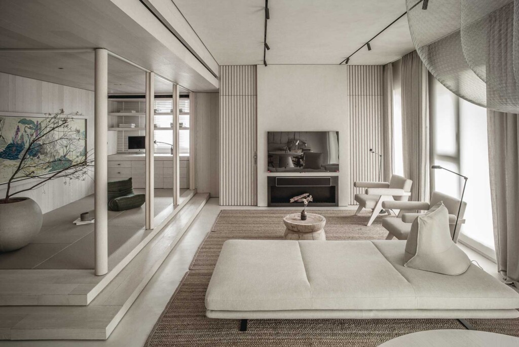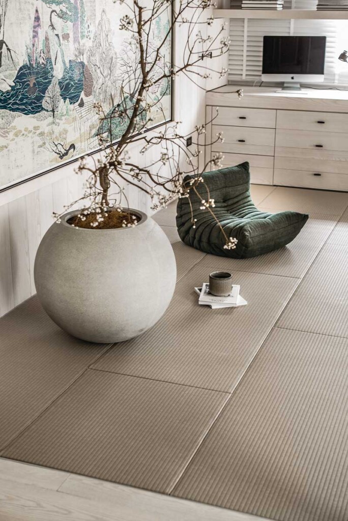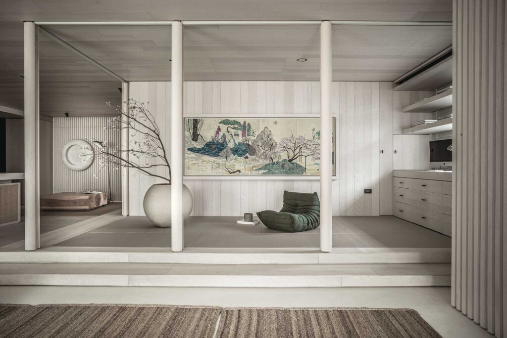 當這個畫面出現在他腦海裡,從材料、燈光到傢俱,全部都水到渠成,整個畫面突然全湧上來了;卓思齊捨棄傳統以客廳為主角的做法,將有如那艘輕舟上的亭台樓閣,以書房空間呈現,還特意架高增加儀式感,並按上裝飾柱及百葉竹簾,軟榻上還有一株烏桕陪伴,文人騷客味濃,來作為空間主視覺,背牆上掛的就是沐冉的山水版畫,仿佛倚山水、飲詩歌,穿越至宋朝的愜意畫面,滿足屋主所想、所及。