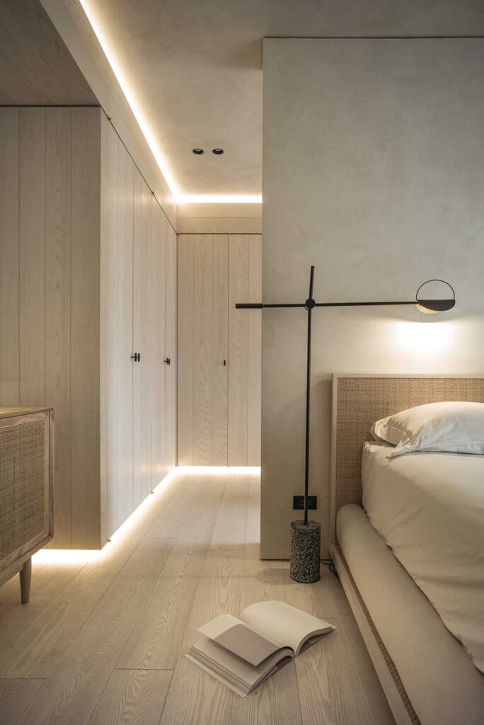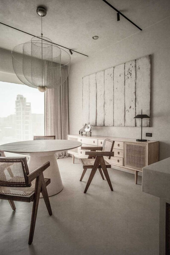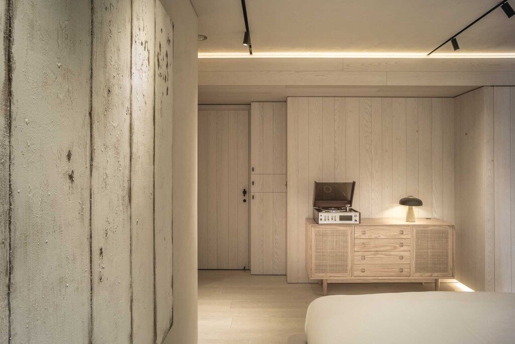 為了延續整體的設計風格,空間裡幾乎看不到太多現代家電,材質上更選用最樸實純粹的木板及礦物漆,來保留其肌理與觸感,而廚房中島、臥室床背板等,特意找傳統師傅手工編制草蓆,甚至連看不見的細節也很考究,如衣櫃門板也捨棄五金鉸鍊,採用最傳統的木栓工法來施做。