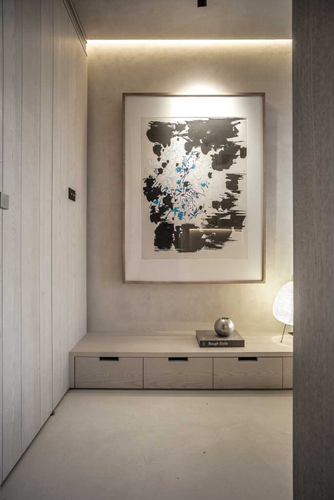 本案『吉光片羽』坐落於台北市中山區,四十一坪的私人住宅,空間規劃為兩房兩廳,由於屋主很喜歡宋朝人文、家居,那種樸實的生活氛圍感,且收藏一些現代創作畫,像是版畫家沐冉的山水作品。卓思齊一看,心中自然浮出一個畫面,「我想到笑傲江湖裡,兩個俠客盪舟於湖上,彈著琵琶唱和、把酒言歡,波光瀲灩的浪漫畫面。」雙手有如隨著畫面裡湖水的波動擺盪著,卓思齊眼中充滿了光。