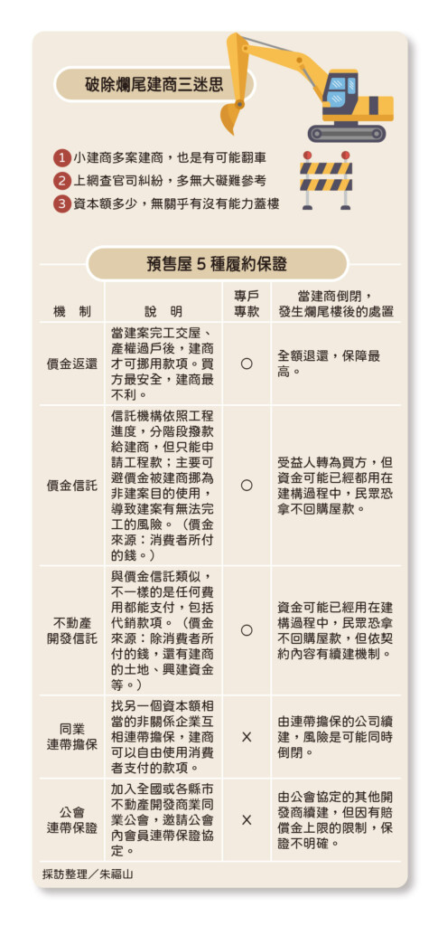 地主的土地如果沒有設定抵押的話,至少發生爛尾樓時,地主還保有土地,銀行不能隨便拍賣;至於已購客可以拿回多少錢,跟該建案採取的履保方式有關,因此購屋族購買預售屋時,建案選擇哪一種履約保證制度至關重要(見圖表),「履約保證共有五種,其中價金返回是最好的,一定得還,但實務上非常少,因為興建期間資金運用缺乏彈性,其次才是價金信託。」蔡志揚說。