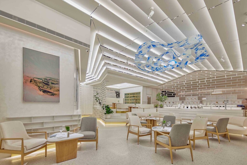 無論是半空中用織品藝術展演掛飾的雲朵、每一道精緻料理的藝術餐具和玻璃器皿,或是宛若白色美術館的室內空間配置等,都是黃以倫與十位設計工藝家,透過不斷對話、碰撞交流下的作品。